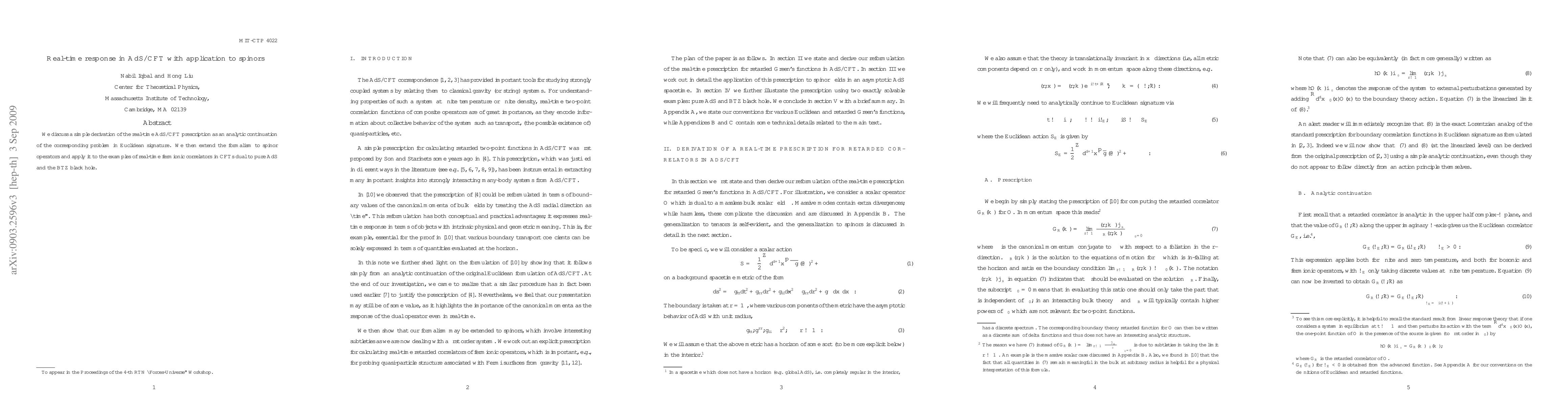 We discuss a simple derivation of the real-time AdS/CFT prescription as an analytic continuation of the corresponding problem in Euclidean signature. We then extend the formalism to spinor operators and apply it to the examples of real-time fermionic correlators in CFTs dual to pure AdS and the BTZ black hole.