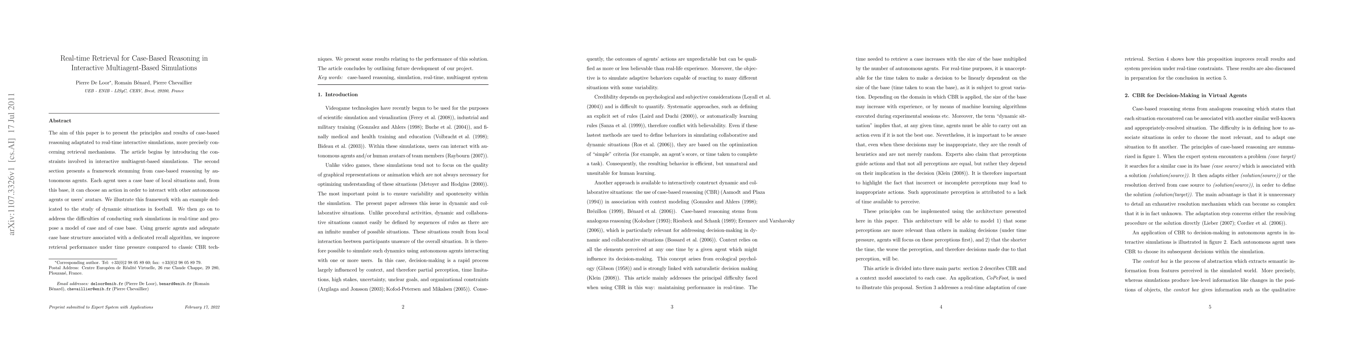 The aim of this paper is to present the principles and results about case-based reasoning adapted to real- time interactive simulations, more precisely concerning retrieval mechanisms. The article begins by introducing the constraints involved in interactive multiagent-based simulations. The second section pre- sents a framework stemming from case-based reasoning by autonomous agents. Each agent uses a case base of local situations and, from this base, it can choose an action in order to interact with other auton- omous agents or users' avatars. We illustrate this framework with an example dedicated to the study of dynamic situations in football. We then go on to address the difficulties of conducting such simulations in real-time and propose a model for case and for case base. Using generic agents and adequate case base structure associated with a dedicated recall algorithm, we improve retrieval performance under time pressure compared to classic CBR techniques. We present some results relating to the performance of this solution. The article concludes by outlining future development of our project.