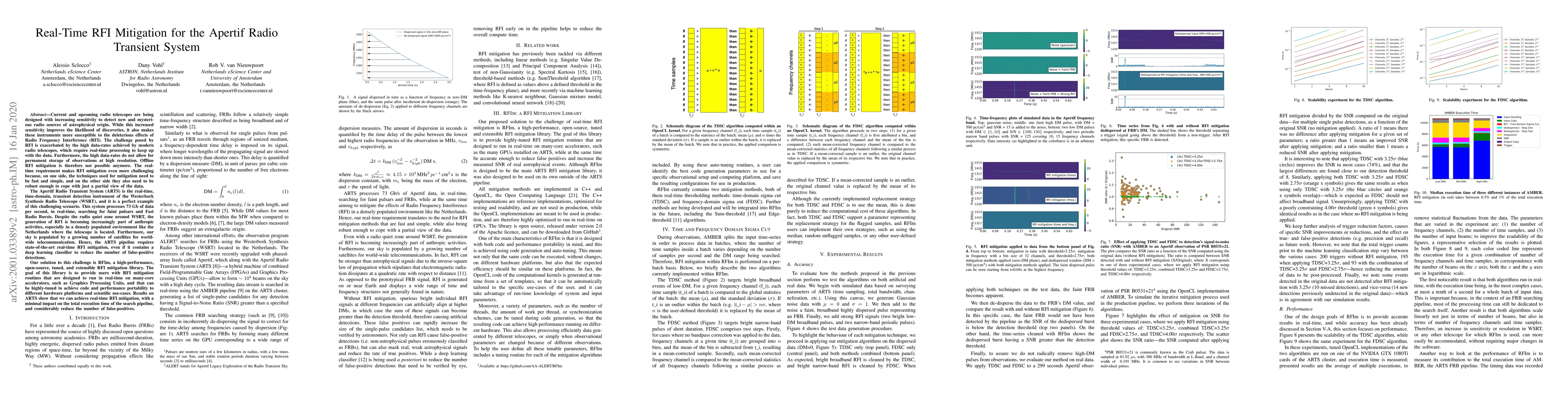Current and upcoming radio telescopes are being designed with increasing sensitivity to detect new and mysterious radio sources of astrophysical origin. While this increased sensitivity improves the likelihood of discoveries, it also makes these instruments more susceptible to the deleterious effects of Radio Frequency Interference (RFI). The challenge posed by RFI is exacerbated by the high data-rates achieved by modern radio telescopes, which require real-time processing to keep up with the data. Furthermore, the high data-rates do not allow for permanent storage of observations at high resolution. Offline RFI mitigation is therefore not possible anymore. The real-time requirement makes RFI mitigation even more challenging because, on one side, the techniques used for mitigation need to be fast and simple, and on the other side they also need to be robust enough to cope with just a partial view of the data. The Apertif Radio Transient System (ARTS) is the real-time, time-domain, transient detection instrument of the Westerbork Synthesis Radio Telescope (WSRT), processing 73 Gb of data per second. Even with a deep learning classifier, the ARTS pipeline requires state-of-the-art real-time RFI mitigation to reduce the number of false-positive detections. Our solution to this challenge is RFIm, a high-performance, open-source, tuned, and extensible RFI mitigation library. The goal of this library is to provide users with RFI mitigation routines that are designed to run in real-time on many-core accelerators, such as Graphics Processing Units, and that can be highly-tuned to achieve code and performance portability to different hardware platforms and scientific use-cases. Results on the ARTS show that we can achieve real-time RFI mitigation, with a minimal impact on the total execution time of the search pipeline, and considerably reduce the number of false-positives.