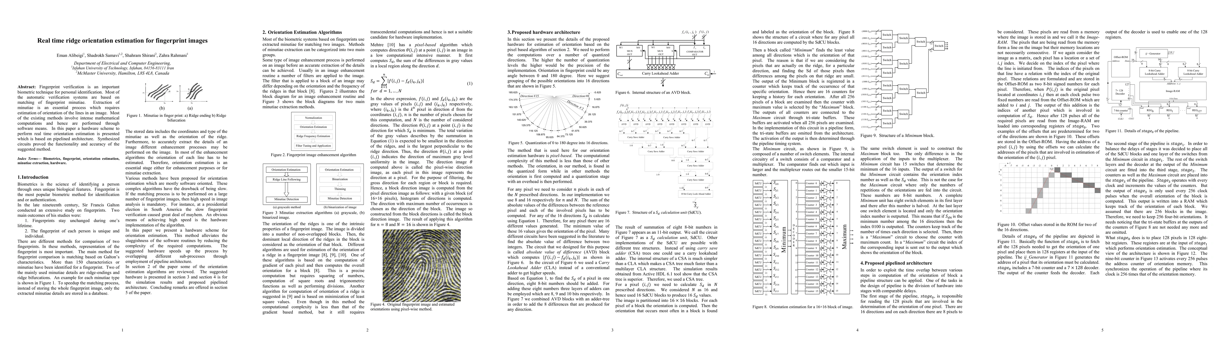 This paper proposes a hardware-based pipelined architecture for real-time ridge orientation estimation in fingerprint images, aiming to reduce computational load and improve processing speed compared to software-based methods. Synthesized circuits validate the functionality and accuracy of the proposed method.