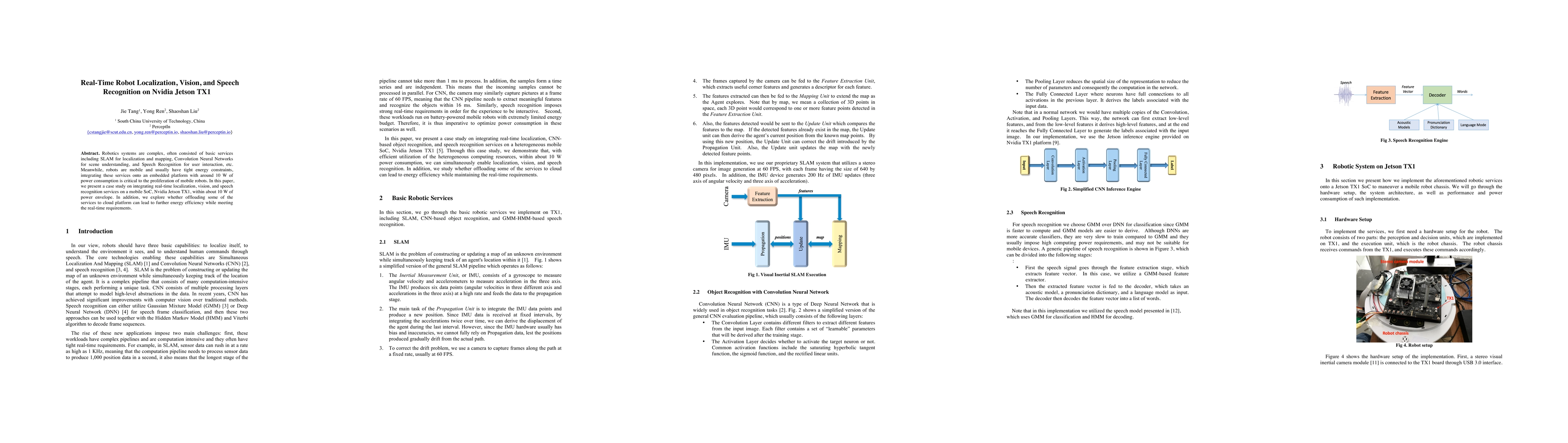 This paper explores integrating real-time localization, vision, and speech recognition on the energy-constrained Nvidia Jetson TX1 SoC, aiming to meet around 10 W power consumption. It also investigates the potential energy benefits of offloading some services to a cloud platform while maintaining real-time performance.