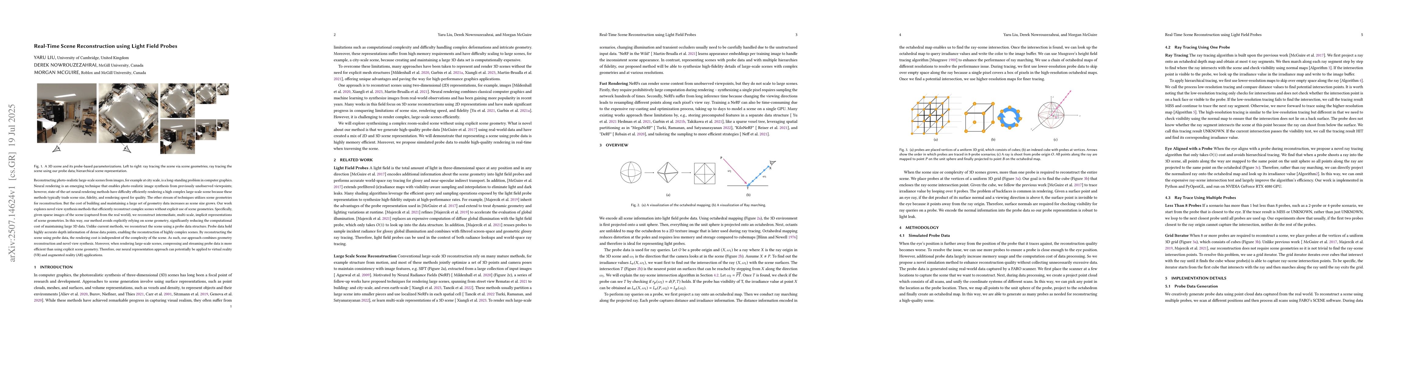 Reconstructing photo-realistic large-scale scenes from images, for example at city scale, is a long-standing problem in computer graphics. Neural rendering is an emerging technique that enables photo-realistic image synthesis from previously unobserved viewpoints; however, state-of-the-art neural rendering methods have difficulty efficiently rendering a high complex large-scale scene because these methods typically trade scene size, fidelity, and rendering speed for quality. The other stream of techniques utilizes scene geometries for reconstruction. But the cost of building and maintaining a large set of geometry data increases as scene size grows. Our work explores novel view synthesis methods that efficiently reconstruct complex scenes without explicit use of scene geometries. Specifically, given sparse images of the scene (captured from the real world), we reconstruct intermediate, multi-scale, implicit representations of scene geometries. In this way, our method avoids explicitly relying on scene geometry, significantly reducing the computational cost of maintaining large 3D data. Unlike current methods, we reconstruct the scene using a probe data structure. Probe data hold highly accurate depth information of dense data points, enabling the reconstruction of highly complex scenes. By reconstructing the scene using probe data, the rendering cost is independent of the complexity of the scene. As such, our approach combines geometry reconstruction and novel view synthesis. Moreover, when rendering large-scale scenes, compressing and streaming probe data is more efficient than using explicit scene geometry. Therefore, our neural representation approach can potentially be applied to virtual reality (VR) and augmented reality (AR) applications.