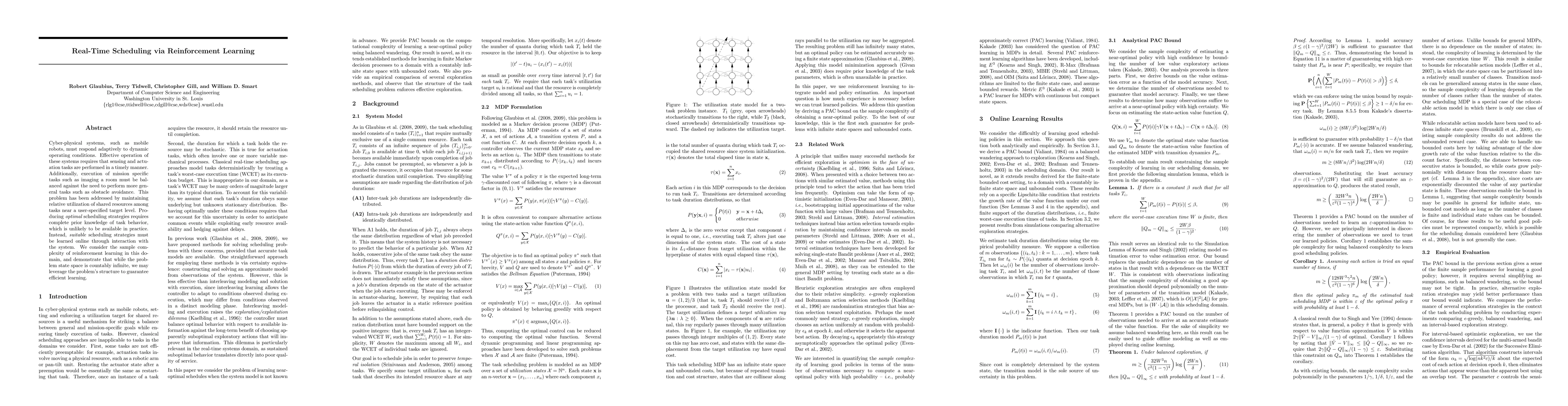 Cyber-physical systems, such as mobile robots, must respond adaptively to dynamic operating conditions. Effective operation of these systems requires that sensing and actuation tasks are performed in a timely manner. Additionally, execution of mission specific tasks such as imaging a room must be balanced against the need to perform more general tasks such as obstacle avoidance. This problem has been addressed by maintaining relative utilization of shared resources among tasks near a user-specified target level. Producing optimal scheduling strategies requires complete prior knowledge of task behavior, which is unlikely to be available in practice. Instead, suitable scheduling strategies must be learned online through interaction with the system. We consider the sample complexity of reinforcement learning in this domain, and demonstrate that while the problem state space is countably infinite, we may leverage the problem's structure to guarantee efficient learning.