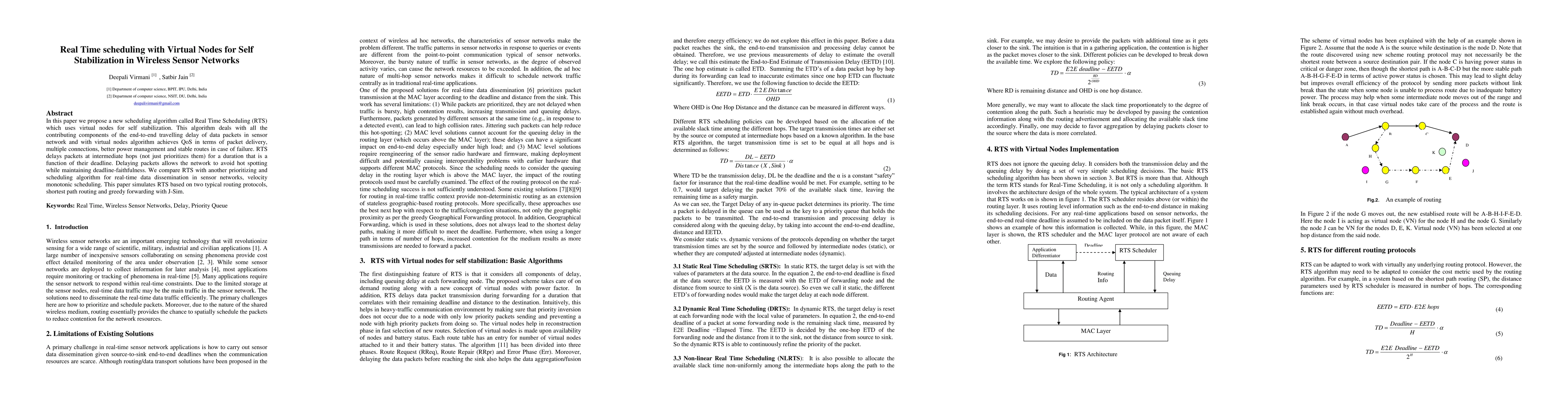 This paper introduces Real Time Scheduling (RTS) using virtual nodes for self-stabilization in wireless sensor networks, aiming to improve QoS through packet delivery, multiple connections, and power management. RTS delays packets at intermediate hops to avoid hot spotting while maintaining deadline-faithfulness, compared against velocity monotonic scheduling via simulations based on shortest path routing and greedy forwarding.