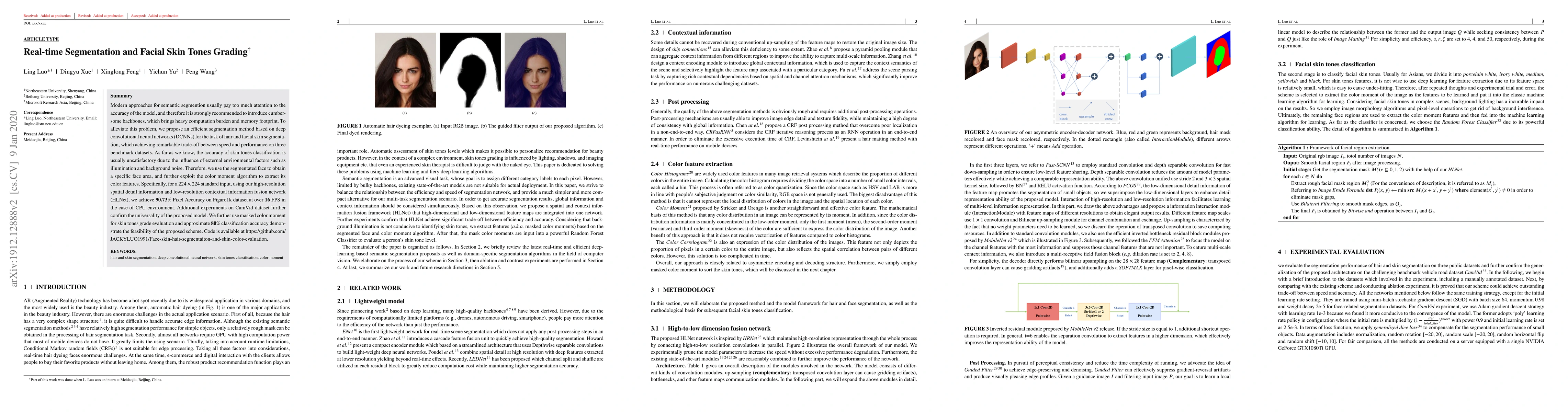 Modern approaches for semantic segmention usually pay too much attention to the accuracy of the model, and therefore it is strongly recommended to introduce cumbersome backbones, which brings heavy computation burden and memory footprint. To alleviate this problem, we propose an efficient segmentation method based on deep convolutional neural networks (DCNNs) for the task of hair and facial skin segmentation, which achieving remarkable trade-off between speed and performance on three benchmark datasets. As far as we know, the accuracy of skin tones classification is usually unsatisfactory due to the influence of external environmental factors such as illumination and background noise. Therefore, we use the segmentated face to obtain a specific face area, and further exploit the color moment algorithm to extract its color features. Specifically, for a 224 x 224 standard input, using our high-resolution spatial detail information and low-resolution contextual information fusion network (HLNet), we achieve 90.73% Pixel Accuracy on Figaro1k dataset at over 16 FPS in the case of CPU environment. Additional experiments on CamVid dataset further confirm the universality of the proposed model. We further use masked color moment for skin tones grade evaluation and approximate 80% classification accuracy demonstrate the feasibility of the proposed scheme.Code is available at https://github.com/JACKYLUO1991/Face-skin-hair-segmentaiton-and-skin-color-evaluation.