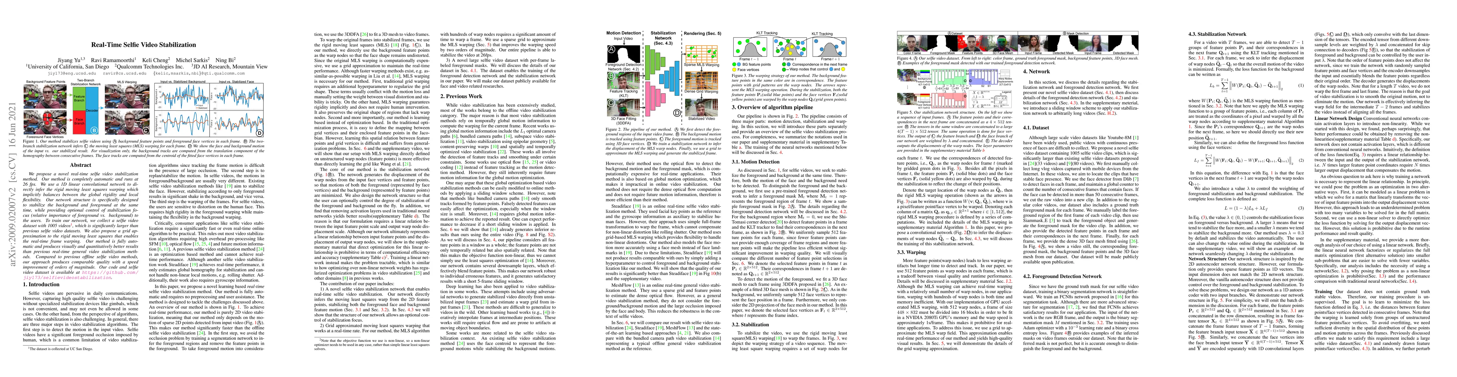 This paper introduces a real-time, automatic selfie video stabilization method using a 1D convolutional network to infer optimal warping, balancing global and local motion. The method is trained on a large dataset and achieves real-time performance, outperforming previous real-time and offline stabilization techniques in both speed and quality.