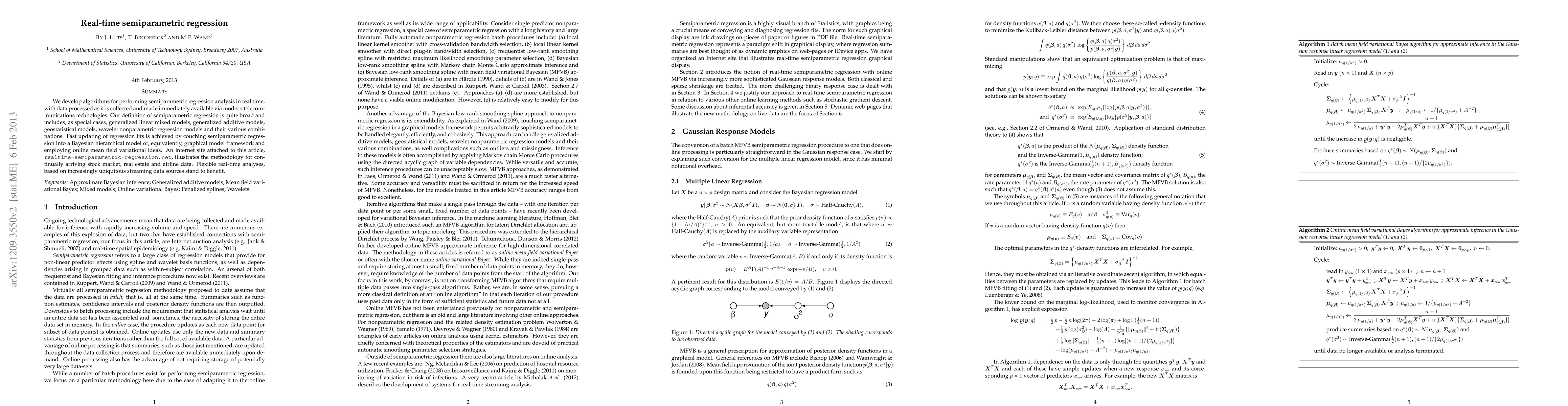 This paper introduces algorithms for real-time semiparametric regression analysis, enabling immediate data processing and availability via telecommunications. The method encompasses various models and uses a Bayesian hierarchical framework with online variational techniques for fast updating.