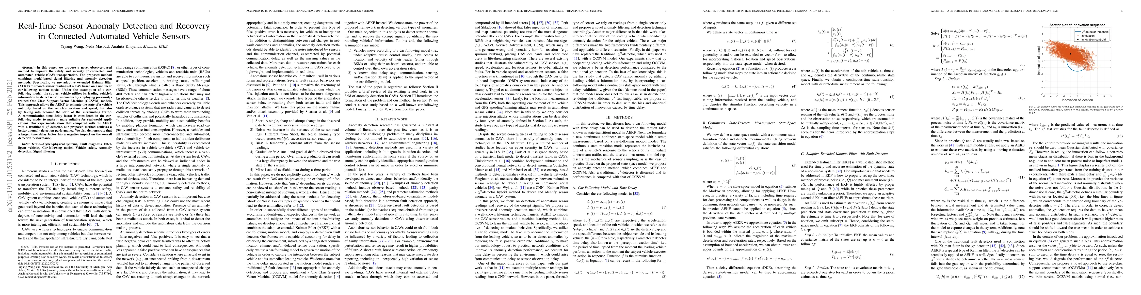 Researchers propose a new method for detecting anomalies in connected automated vehicle sensors using adaptive extended Kalman filter and One Class Support Vector Machine models to improve safety and security. The approach outperforms traditional methods with better anomaly detection performance.