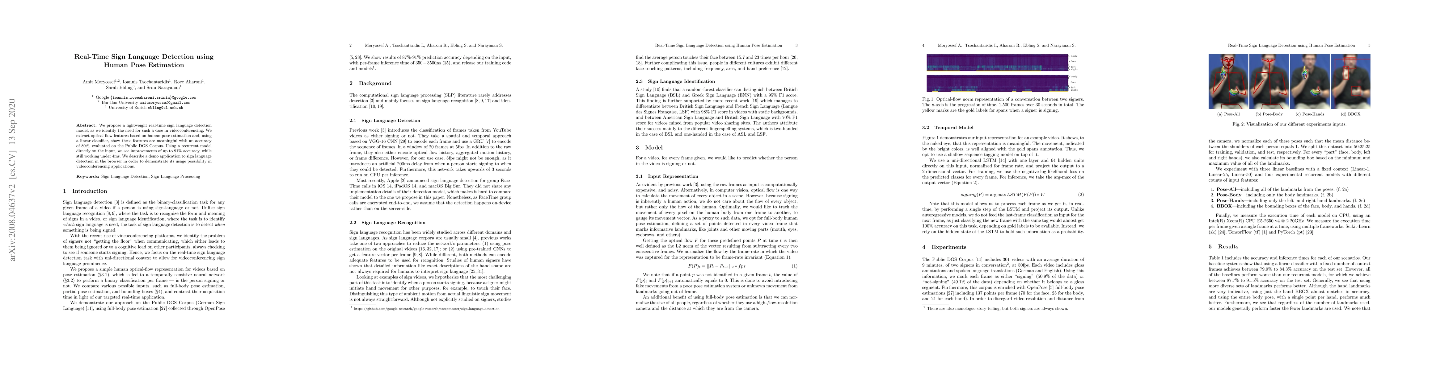 This paper presents a real-time sign language detection model leveraging human pose estimation and optical flow features, achieving up to 91% accuracy with minimal latency. The proposed model demonstrates potential for integration into videoconferencing applications to facilitate communication.