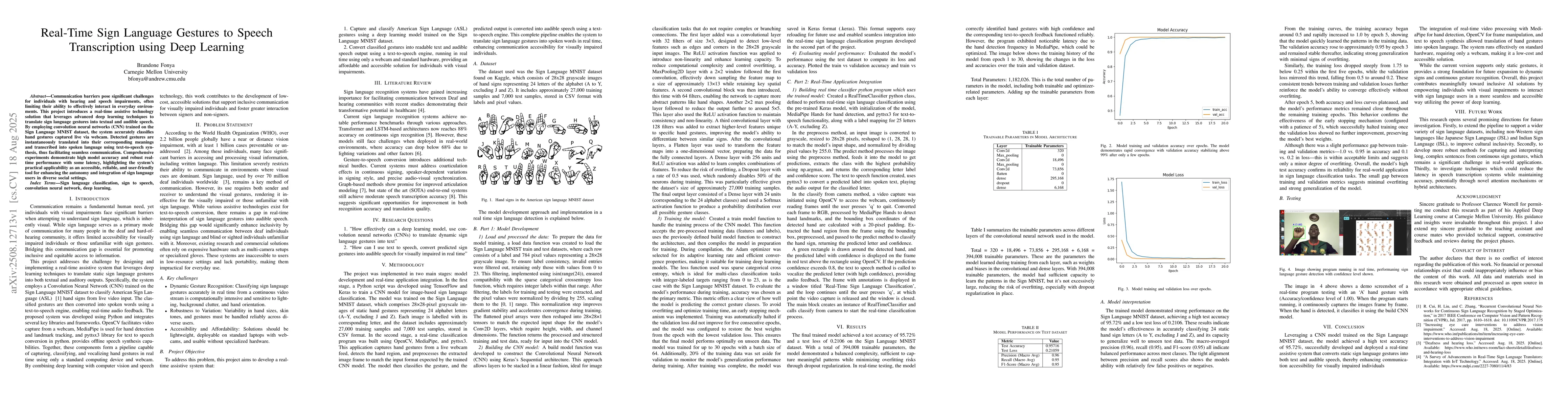 Communication barriers pose significant challenges for individuals with hearing and speech impairments, often limiting their ability to effectively interact in everyday environments. This project introduces a real-time assistive technology solution that leverages advanced deep learning techniques to translate sign language gestures into textual and audible speech. By employing convolution neural networks (CNN) trained on the Sign Language MNIST dataset, the system accurately classifies hand gestures captured live via webcam. Detected gestures are instantaneously translated into their corresponding meanings and transcribed into spoken language using text-to-speech synthesis, thus facilitating seamless communication. Comprehensive experiments demonstrate high model accuracy and robust real-time performance with some latency, highlighting the system's practical applicability as an accessible, reliable, and user-friendly tool for enhancing the autonomy and integration of sign language users in diverse social settings.