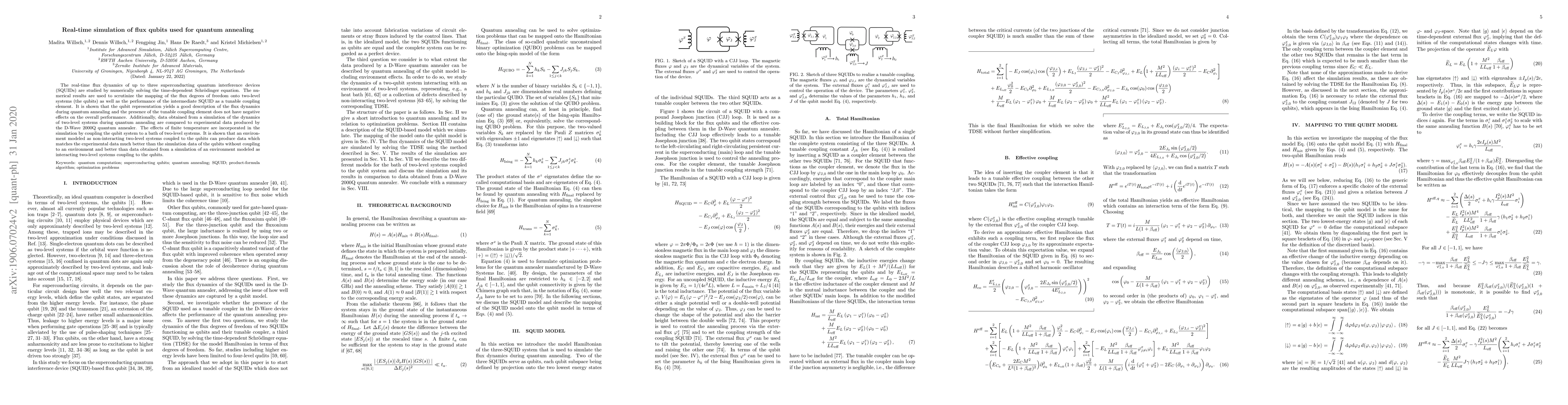 The real-time flux dynamics of up to three superconducting quantum interference devices (SQUIDs) are studied by numerically solving the time-dependent Schr\"odinger equation. The numerical results are used to scrutinize the mapping of the flux degrees of freedom onto two-level systems (the qubits) as well as the performance of the intermediate SQUID as a tunable coupling element. It is shown that the qubit representation yields a good description of the flux dynamics during quantum annealing and the presence of the tunable coupling element does not have negative effects on the overall performance. Additionally, data obtained from a simulation of the dynamics of two-level systems during quantum annealing are compared to experimental data produced by the D-Wave 2000Q quantum annealer. The effects of finite temperature are incorporated in the simulation by coupling the qubit system to a bath of two-level systems. It is shown that an environment modeled as non-interacting two-level systems coupled to the qubits can produce data which matches the experimental data much better than the simulation data of the qubits without coupling to an environment and better than data obtained from a simulation of an environment modeled as interacting two-level systems coupling to the qubits.