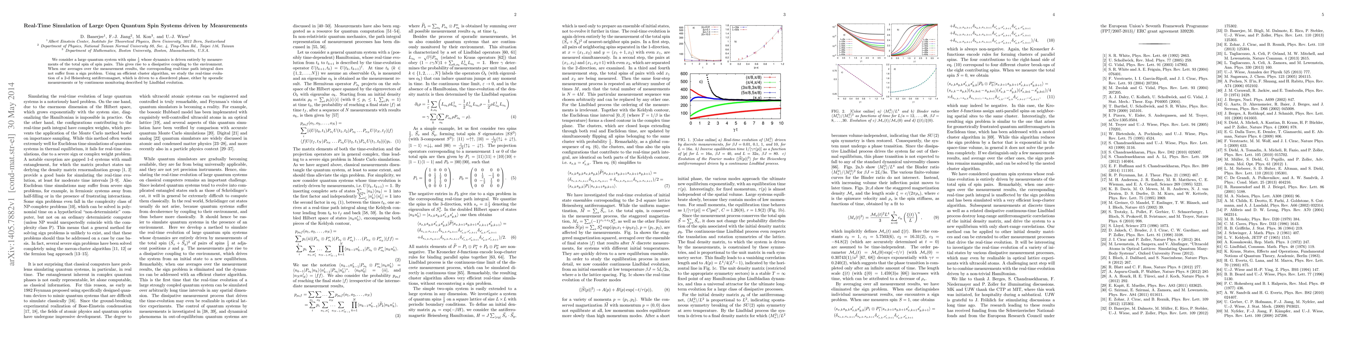 We consider a large quantum system with spins $\frac{1}{2}$ whose dynamics is driven entirely by measurements of the total spin of spin pairs. This gives rise to a dissipative coupling to the environment. When one averages over the measurement results, the corresponding real-time path integral does not suffer from a sign problem. Using an efficient cluster algorithm, we study the real-time evolution of a 2-d Heisenberg antiferromagnet, which is driven to a disordered phase, either by sporadic measurements or by continuous monitoring described by Lindblad evolution.