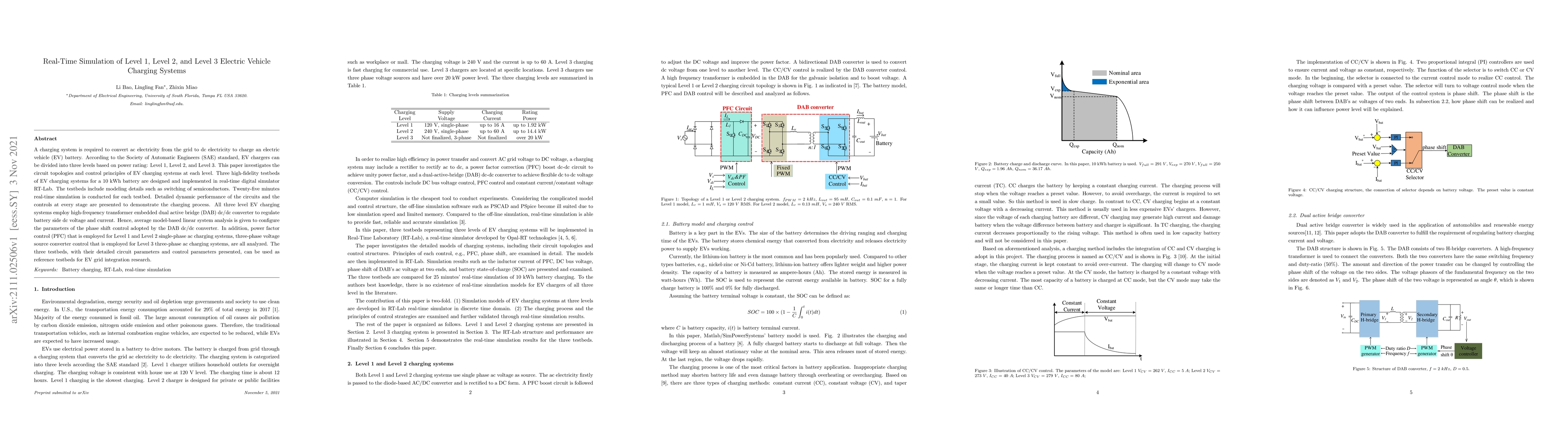 A charging system is required to convert ac electricity from the grid to dc electricity to charge an electric vehicle (EV) battery. According to the Society of Automatic Engineers (SAE) standard, EV chargers can be divided into three levels based on power rating: Level 1, Level 2, and Level 3. This paper investigates the circuit topologies and control principles of EV charging systems at each level. Three high-fidelity testbeds of EV charging systems for a 10 kWh battery are designed and implemented in real-time digital simulator RT-Lab. The testbeds include modeling details such as switching of semiconductors. Twenty-five minutes real-time simulation is conducted for each testbed. Detailed dynamic performance of the circuits and the controls at every stage are presented to demonstrate the charging process. All three level EV charging systems employ high-frequency transformer embedded dual active bridge (DAB) dc/dc converter to regulate battery side dc voltage and current. Hence, average model-based linear system analysis is given to configure the parameters of the phase shift control adopted by the DAB dc/dc converter. In addition, power factor control (PFC) that is employed for Level 1 and Level 2 single-phase ac charging systems, three-phase voltage source converter control that is employed for Level 3 three-phase ac charging systems, are all analyzed. The three testbeds, with their detailed circuit parameters and control parameters presented, can be used as reference testbeds for EV grid integration research.