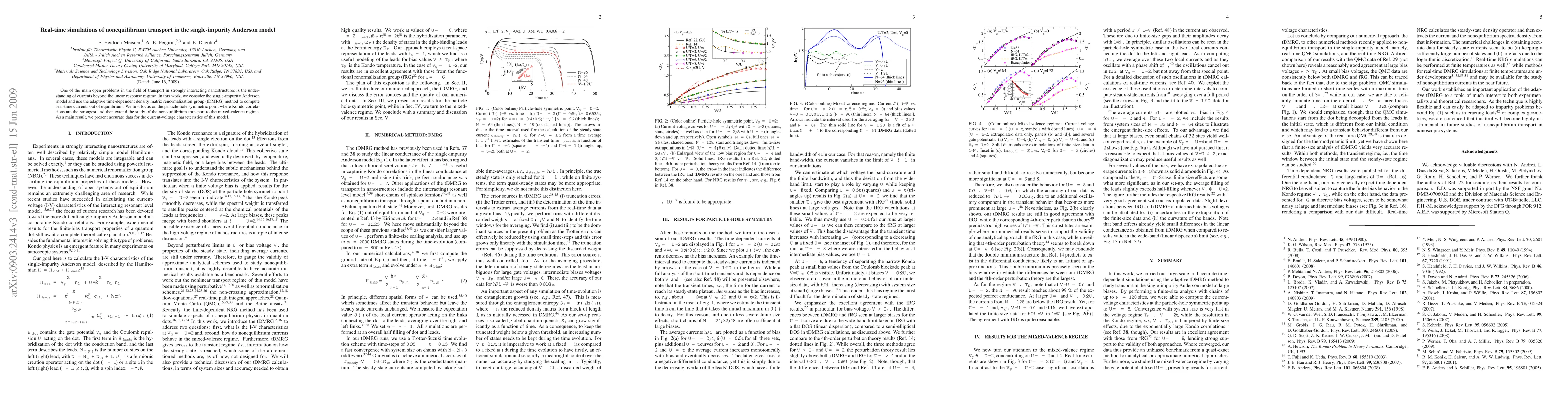 This paper employs the adaptive time-dependent density matrix renormalization group (tDMRG) to simulate real-time transport in the single-impurity Anderson model, focusing on nonequilibrium conditions beyond linear response. Key findings include detailed current-voltage characteristics in both particle-hole symmetric and mixed-valence regimes.
