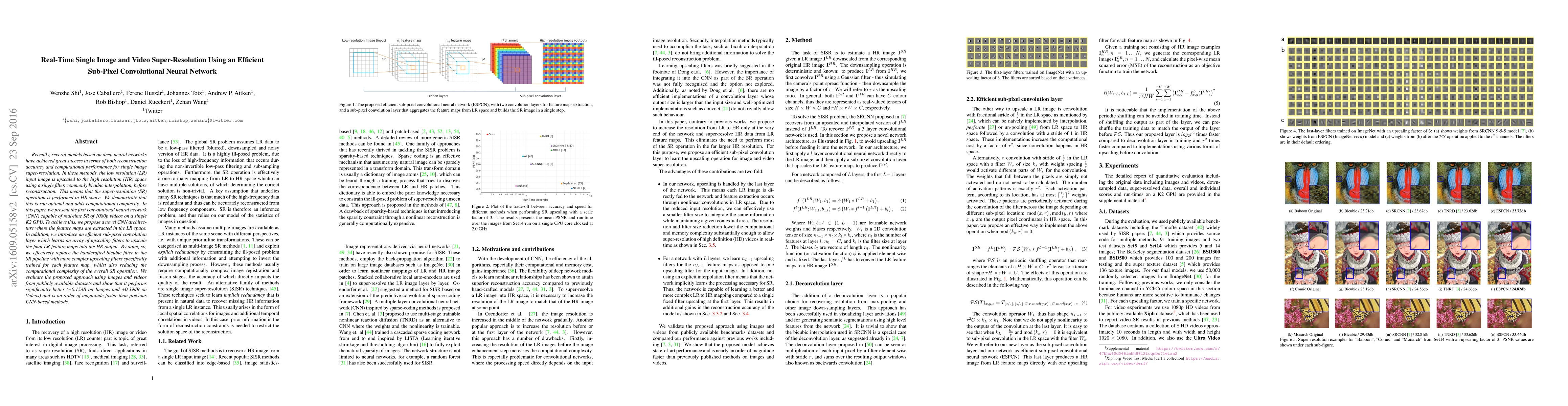 Recently, several models based on deep neural networks have achieved great success in terms of both reconstruction accuracy and computational performance for single image super-resolution. In these methods, the low resolution (LR) input image is upscaled to the high resolution (HR) space using a single filter, commonly bicubic interpolation, before reconstruction. This means that the super-resolution (SR) operation is performed in HR space. We demonstrate that this is sub-optimal and adds computational complexity. In this paper, we present the first convolutional neural network (CNN) capable of real-time SR of 1080p videos on a single K2 GPU. To achieve this, we propose a novel CNN architecture where the feature maps are extracted in the LR space. In addition, we introduce an efficient sub-pixel convolution layer which learns an array of upscaling filters to upscale the final LR feature maps into the HR output. By doing so, we effectively replace the handcrafted bicubic filter in the SR pipeline with more complex upscaling filters specifically trained for each feature map, whilst also reducing the computational complexity of the overall SR operation. We evaluate the proposed approach using images and videos from publicly available datasets and show that it performs significantly better (+0.15dB on Images and +0.39dB on Videos) and is an order of magnitude faster than previous CNN-based methods.