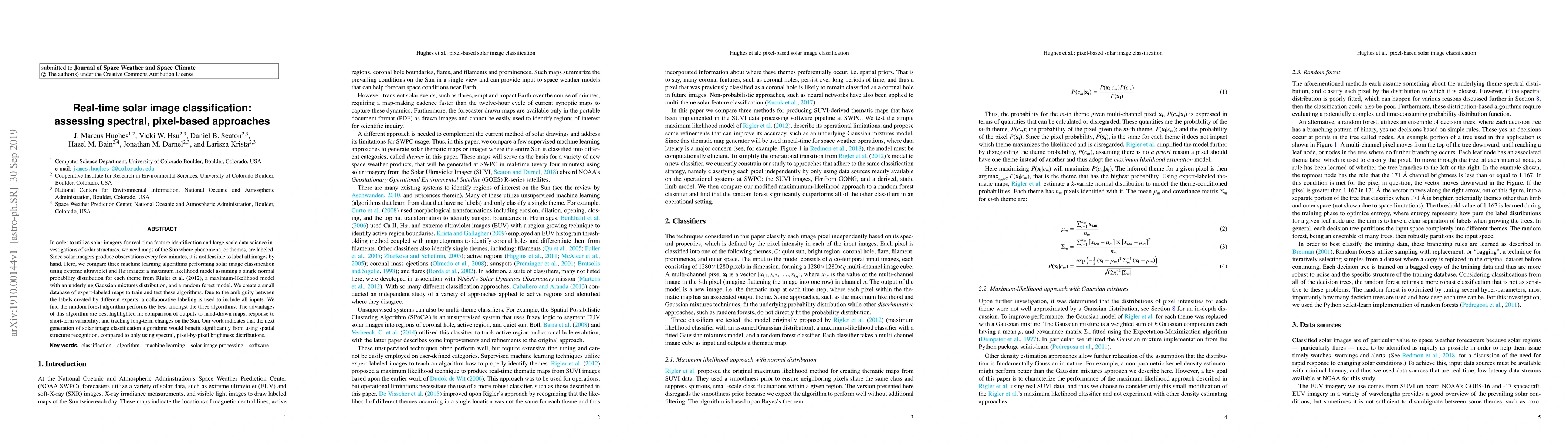 This paper compares three machine learning algorithms for real-time solar image classification, finding that the random forest model outperforms others in labeling solar phenomena. The study emphasizes the importance of spatial structure recognition over spectral data alone for future solar image classification.