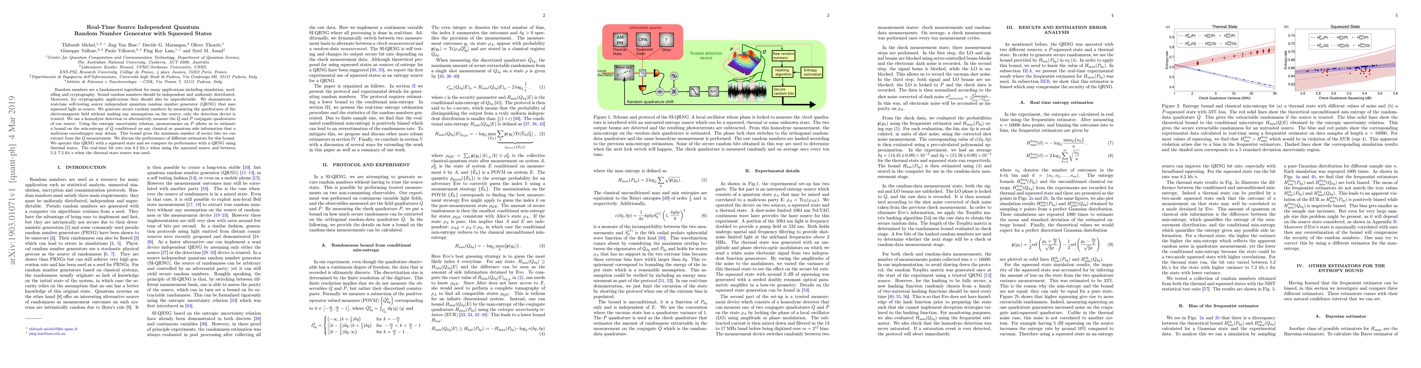 This paper presents a real-time, self-testing quantum random number generator (QRNG) utilizing squeezed light to generate secure random numbers. The method measures the quadratures of the electromagnetic field without assumptions about the source, ensuring unpredictability and independence, crucial for cryptographic applications.