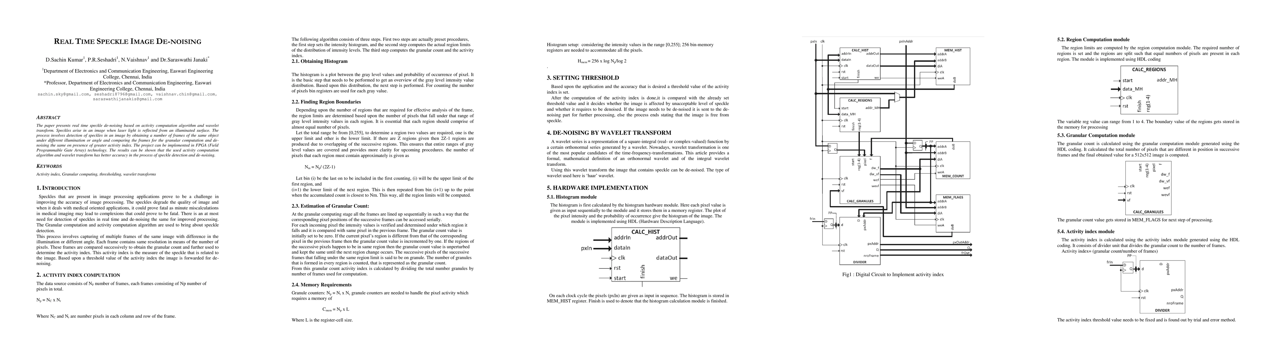 The paper presents real time speckle de-noising based on activity computation algorithm and wavelet transform. Speckles arise in an image when laser light is reflected from an illuminated surface. The process involves detection of speckles in an image by obtaining a number of frames of the same object under different illumination or angle and comparing the frames for the granular computation and de-noising the same on presence of greater activity index. The project can be implemented in FPGA (Field Programmable Gate Array) technology. The results can be shown that the used activity computation algorithm and wavelet transform has better accuracy in the process of speckle detection and de-noising.