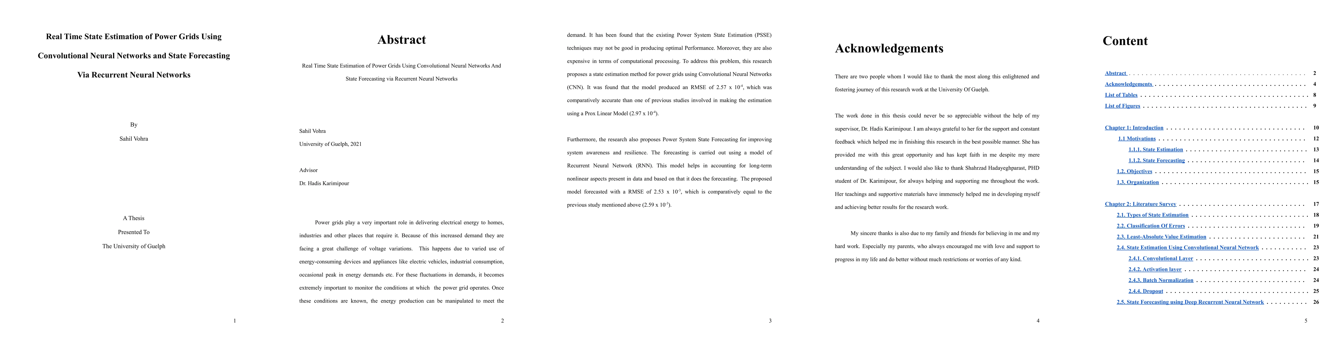 This research proposes a novel method for real-time state estimation of power grids using Convolutional Neural Networks (CNN) that achieves a lower RMSE of 2.57 x 10^-4 compared to previous methods. Additionally, it introduces a Recurrent Neural Network (RNN) for state forecasting, achieving an RMSE of 2.53 x 10^-3, which is competitive with existing techniques.