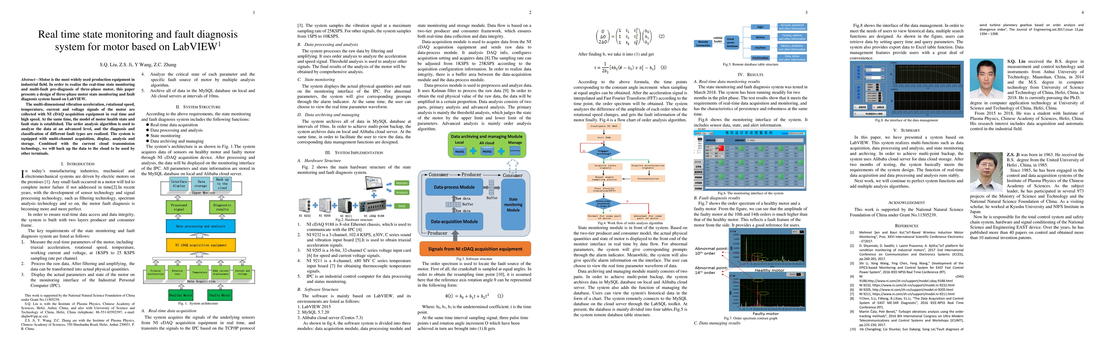 This paper presents a LabVIEW-based real-time monitoring and fault diagnosis system for three-phase motors, collecting multi-dimensional signals for advanced fault analysis and classification. The system uses NI cDAQ for real-time data acquisition and cloud technology for data backup.