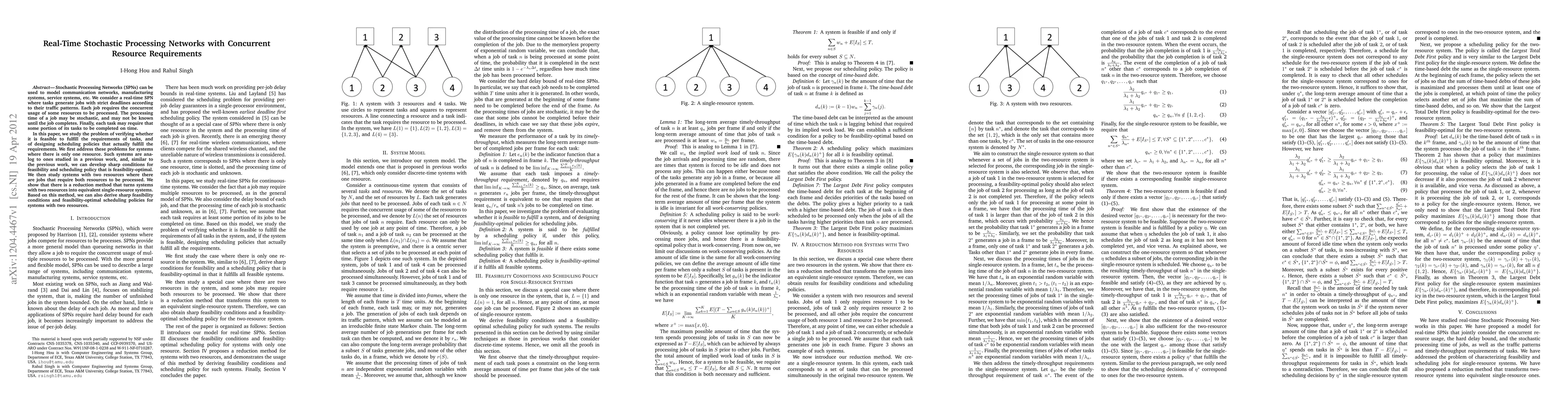 Stochastic Processing Networks (SPNs) can be used to model communication networks, manufacturing systems, service systems, etc. We consider a real-time SPN where tasks generate jobs with strict deadlines according to their traffic patterns. Each job requires the concurrent usage of some resources to be processed. The processing time of a job may be stochastic, and may not be known until the job completes. Finally, each task may require that some portion of its tasks to be completed on time. In this paper, we study the problem of verifying whether it is feasible to fulfill the requirements of tasks, and of designing scheduling policies that actually fulfill the requirements. We first address these problems for systems where there is only one resource. Such systems are analog to ones studied in a previous work, and, similar to the previous work, we can develop sharp conditions for feasibility and scheduling policy that is feasibility-optimal. We then study systems with two resources where there are jobs that require both resources to be processed. We show that there is a reduction method that turns systems with two resources into equivalent single-resource systems. Based on this method, we can also derive sharp feasibility conditions and feasibility-optimal scheduling policies for systems with two resources.