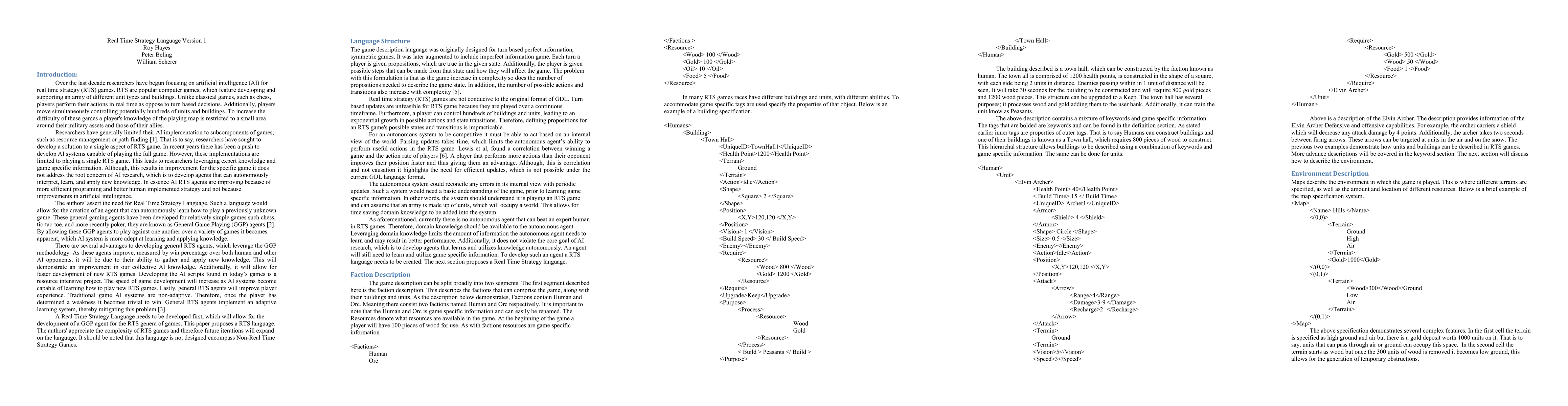 Real Time Strategy (RTS) games provide complex domain to test the latest artificial intelligence (AI) research. In much of the literature, AI systems have been limited to playing one game. Although, this specialization has resulted in stronger AI gaming systems it does not address the key concerns of AI researcher. AI researchers seek the development of AI agents that can autonomously interpret learn, and apply new knowledge. To achieve human level performance, current AI systems rely on game specific knowledge of an expert. The paper presents the full RTS language in hopes of shifting the current research focus to the development of general RTS agents. General RTS agents are AI gaming systems that can play any RTS games, defined in the RTS language. This prevents game specific knowledge from being hard coded into the system, thereby facilitating research that addresses the fundamental concerns of artificial intelligence.