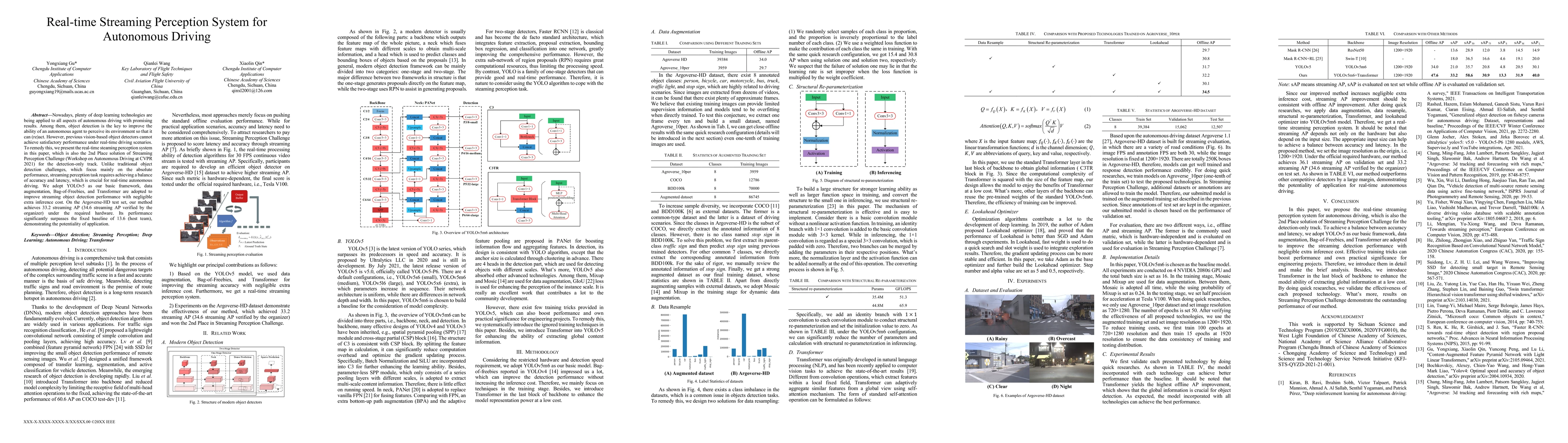 This paper presents a real-time streaming perception system for autonomous driving using YOLOv5, data augmentation, and Transformer techniques to balance accuracy and latency. The proposed system achieves a streaming AP of 33.2, outperforming the baseline by a significant margin, and securing 2nd place in the Streaming Perception Challenge.