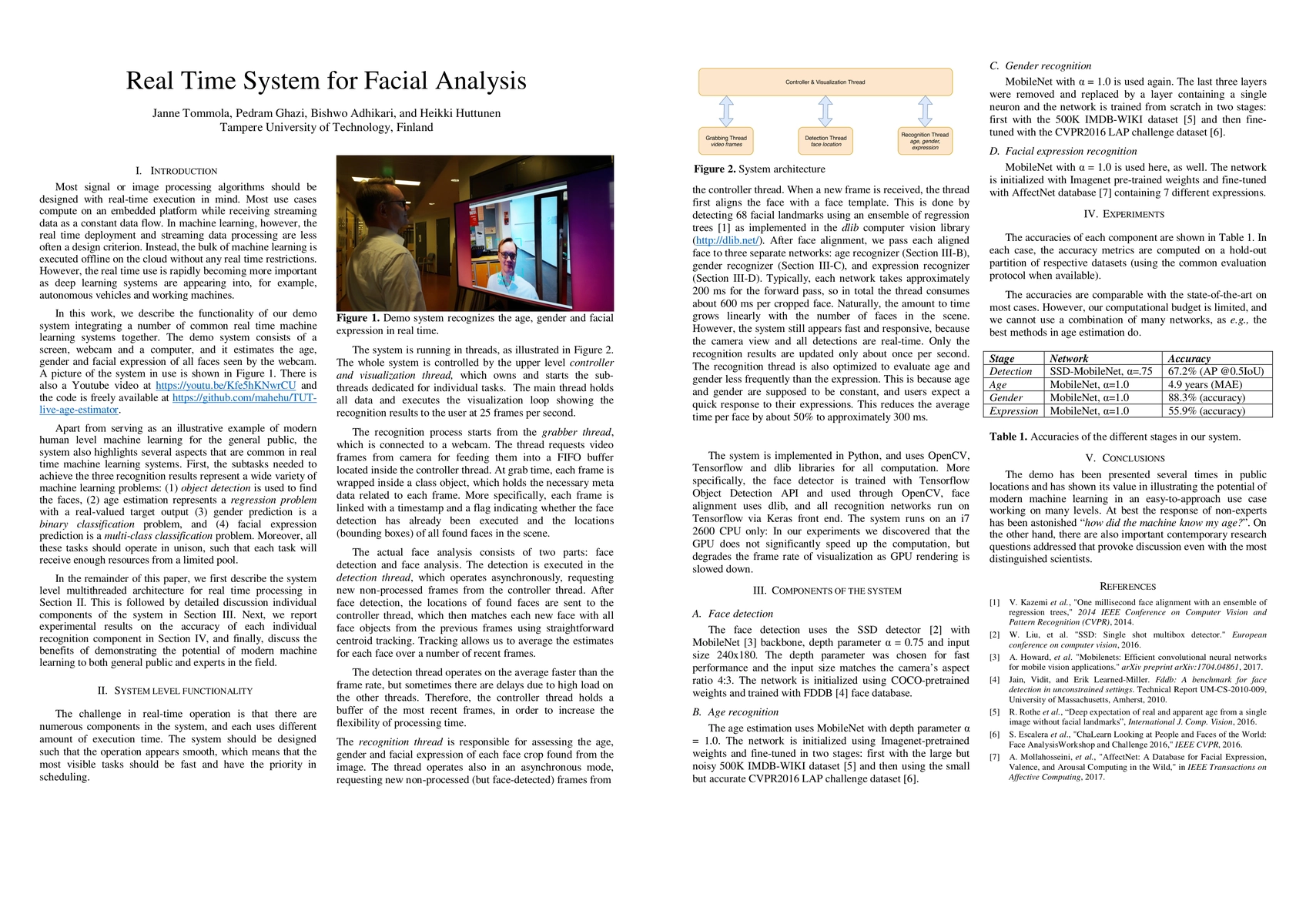 This paper presents a real-time facial analysis system utilizing convolutional neural networks to recognize age, gender, and facial expression. It details the interaction of components like frame grabbing, face detection, and recognition processes. The Python code, employing keras/tensorflow, opencv, and dlib libraries, is available for download.