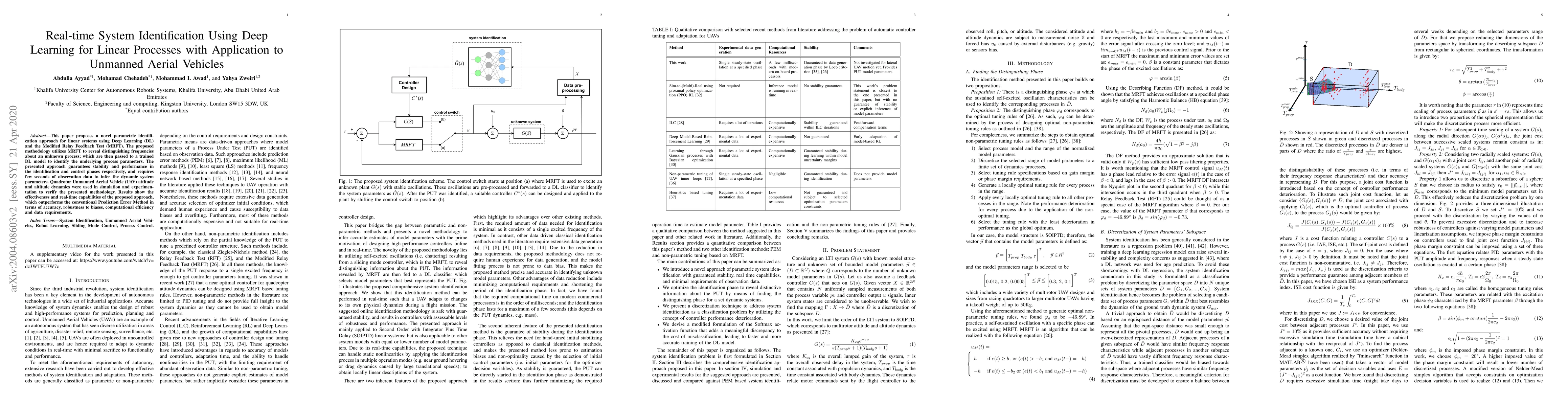 This paper proposes a novel parametric identification approach for linear systems using Deep Learning (DL) and the Modified Relay Feedback Test (MRFT). The proposed methodology utilizes MRFT to reveal distinguishing frequencies about an unknown process; which are then passed to a trained DL model to identify the underlying process parameters. The presented approach guarantees stability and performance in the identification and control phases respectively, and requires few seconds of observation data to infer the dynamic system parameters. Quadrotor Unmanned Aerial Vehicle (UAV) attitude and altitude dynamics were used in simulation and experimentation to verify the presented methodology. Results show the effectiveness and real-time capabilities of the proposed approach, which outperforms the conventional Prediction Error Method in terms of accuracy, robustness to biases, computational efficiency and data requirements.