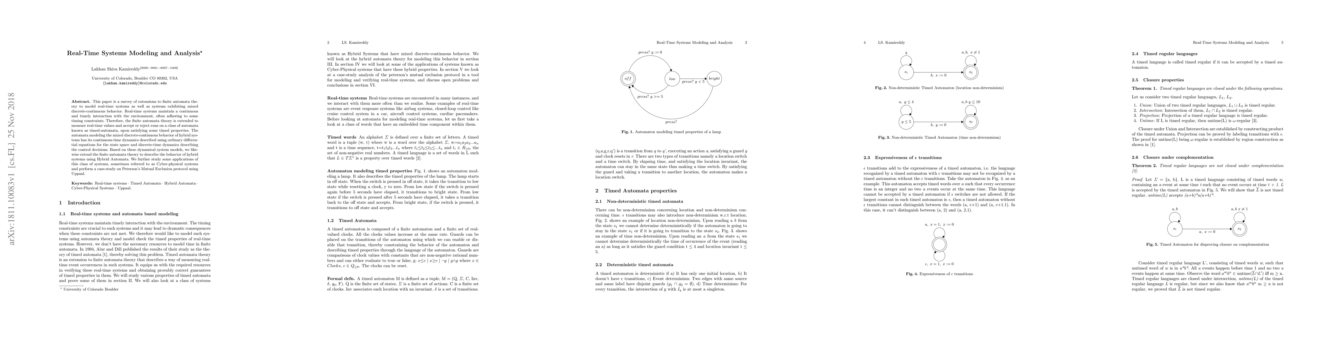 This paper is a survey of extensions to finite automata theory to model real-time systems as well as systems exhibiting mixed discrete-continuous behavior. Real-time systems maintain a continuous and timely interaction with the environment, often adhering to some timing constraints. Therefore, the finite automata theory is extended to measure real-time values and accept or reject runs on a class of automata known as timed-automata, upon satisfying some timed properties. The automata modeling the mixed discrete-continuous behavior of hybrid systems has its continuous-time dynamics described using ordinary differential equations for the state space and discrete-time dynamics describing the control decisions. Based on these dynamical system models, we likewise extend the finite automata theory to describe the behavior of hybrid systems using Hybrid Automata. We further study some applications of this class of systems, sometimes referred to as Cyber-physical systems and perform a case-study on Peterson's Mutual Exclusion protocol using Uppaal.