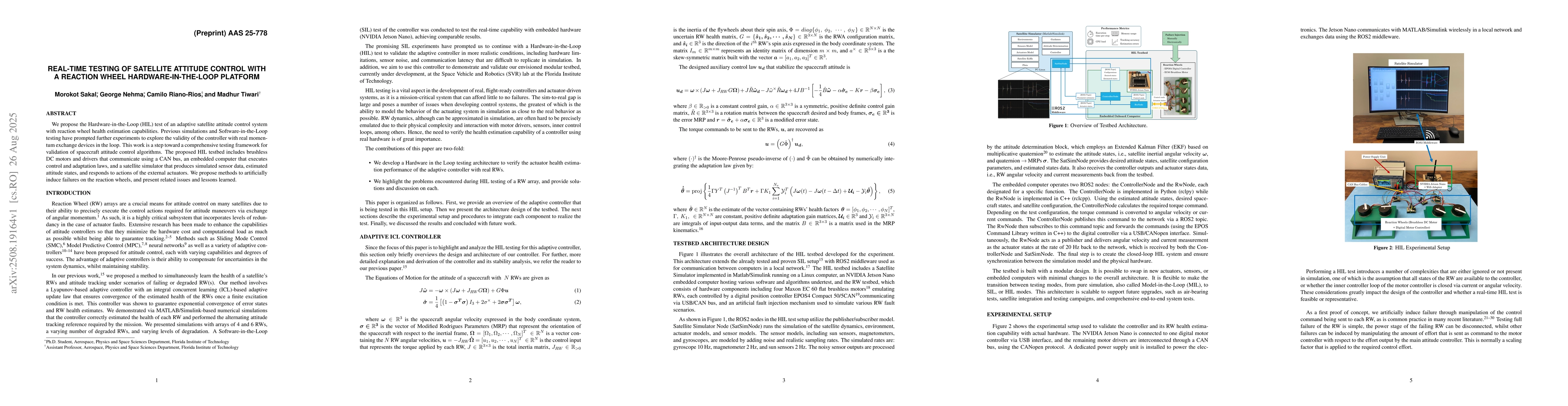 We propose the Hardware-in-the-Loop (HIL) test of an adaptive satellite attitude control system with reaction wheel health estimation capabilities. Previous simulations and Software-in-the-Loop testing have prompted further experiments to explore the validity of the controller with real momentum exchange devices in the loop. This work is a step toward a comprehensive testing framework for validation of spacecraft attitude control algorithms. The proposed HIL testbed includes brushless DC motors and drivers that communicate using a CAN bus, an embedded computer that executes control and adaptation laws, and a satellite simulator that produces simulated sensor data, estimated attitude states, and responds to actions of the external actuators. We propose methods to artificially induce failures on the reaction wheels, and present related issues and lessons learned.