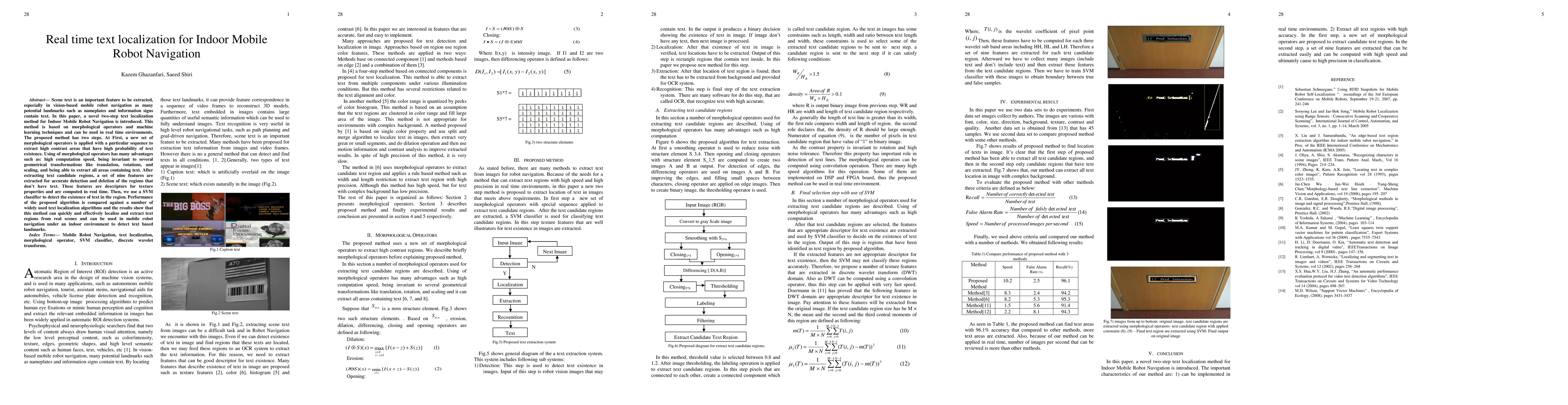 This paper introduces a novel two-step text localization method for indoor mobile robot navigation using morphological operators and machine learning. The method efficiently extracts text regions in real-time and employs a SVM classifier to accurately detect text, outperforming existing algorithms.