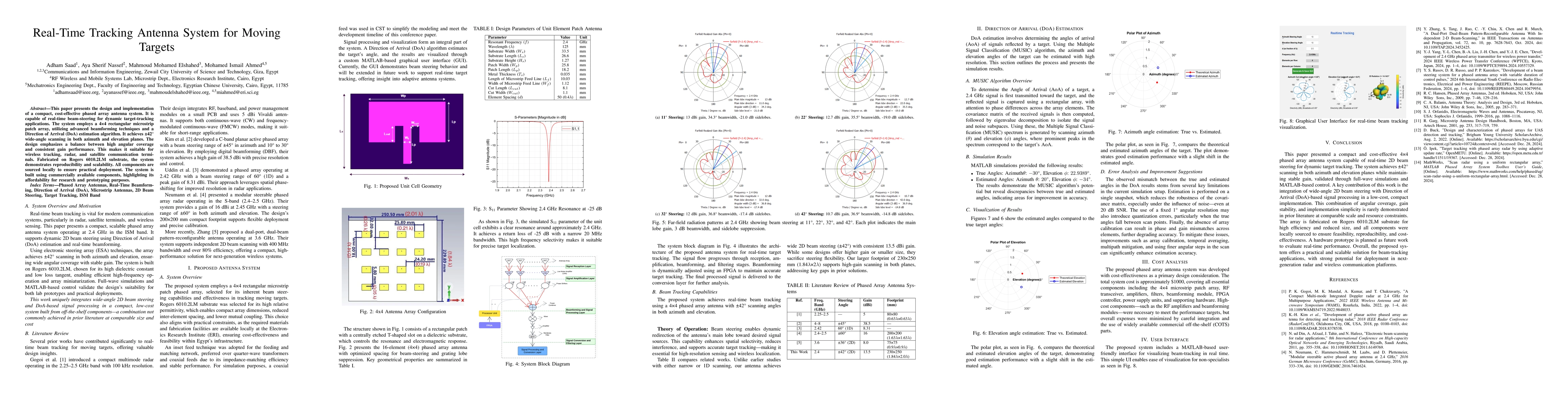 This paper presents the design and implementation of a compact, cost-effective phased array antenna system. It is capable of real-time beam-steering for dynamic target-tracking applications. The system employs a 4$\times$4 rectangular microstrip patch array, utilizing advanced beamforming techniques and a Direction of Arrival (DoA) estimation algorithm. It achieves $\pm 42^{\circ}$ wide-angle scanning in both azimuth and elevation planes. The design emphasizes a balance between high angular coverage and consistent gain performance. This makes it suitable for wireless tracking, radar, and satellite communication terminals. Fabricated on Rogers 6010.2LM substrate, the system demonstrates reproducibility and scalability. All components are sourced locally to ensure practical deployment. The system is built using commercially available components, highlighting its affordability for research and prototyping purposes.