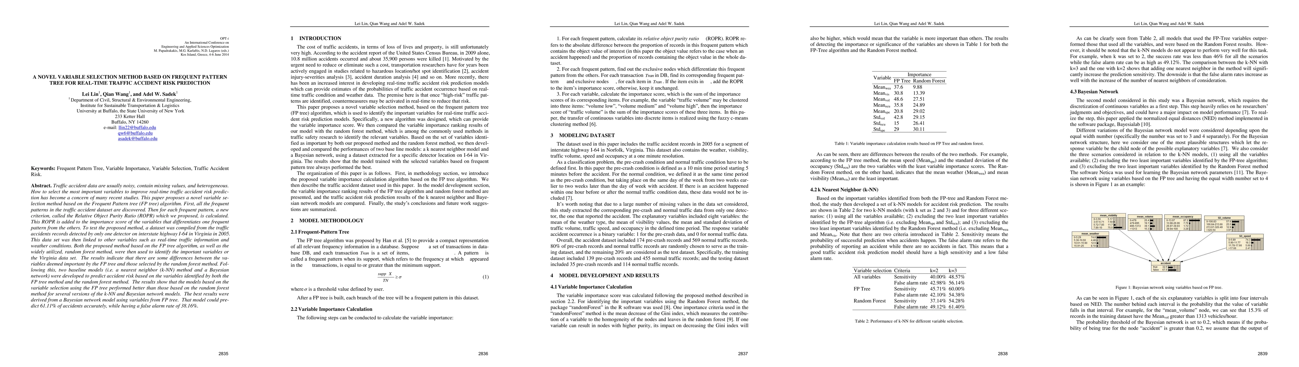 This paper introduces a novel Frequent Pattern tree (FP tree) algorithm for selecting important variables to improve real-time traffic accident risk prediction. The proposed method, which uses a Relative Object Purity Ratio (ROPR) to evaluate variable importance, outperformed the random forest method in identifying significant variables, leading to better predictive performance in k-NN and Bayesian network models, with the latter achieving 61.11% accuracy.