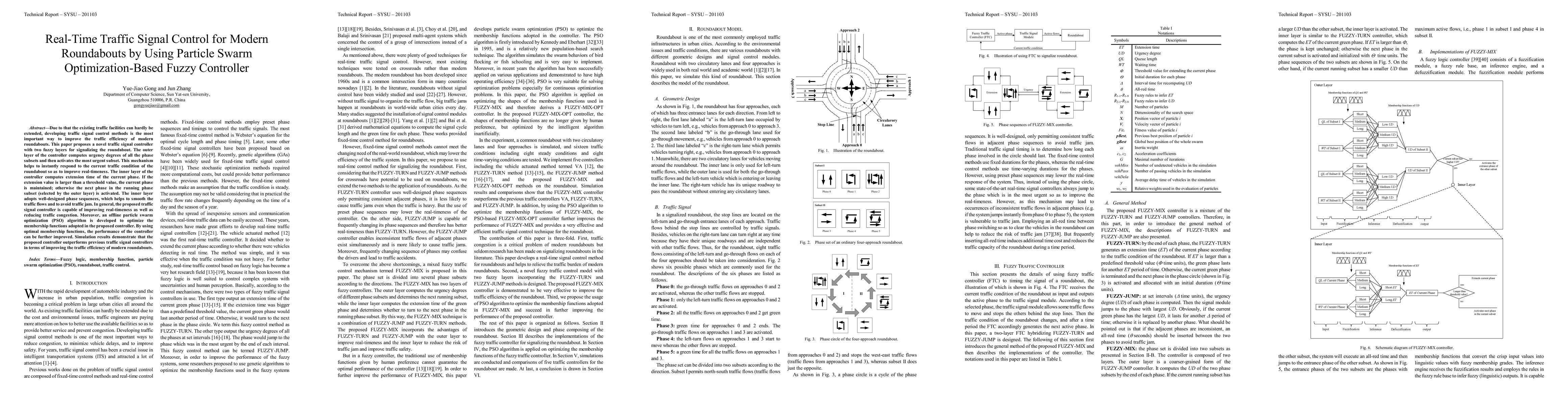 Due to that the existing traffic facilities can hardly be extended, developing traffic signal control methods is the most important way to improve the traffic efficiency of modern roundabouts. This paper proposes a novel traffic signal controller with two fuzzy layers for signalizing the roundabout. The outer layer of the controller computes urgency degrees of all the phase subsets and then activates the most urgent subset. This mechanism helps to instantly respond to the current traffic condition of the roundabout so as to improve real-timeness. The inner layer of the controller computes extension time of the current phase. If the extension value is larger than a threshold value, the current phase is maintained; otherwise the next phase in the running phase subset (selected by the outer layer) is activated. The inner layer adopts well-designed phase sequences, which helps to smooth the traffic flows and to avoid traffic jam. In general, the proposed traffic signal controller is capable of improving real-timeness as well as reducing traffic congestion. Moreover, an offline particle swarm optimization (PSO) algorithm is developed to optimize the membership functions adopted in the proposed controller. By using optimal membership functions, the performance of the controller can be further improved. Simulation results demonstrate that the proposed controller outperforms previous traffic signal controllers in terms of improving the traffic efficiency of modern roundabouts.