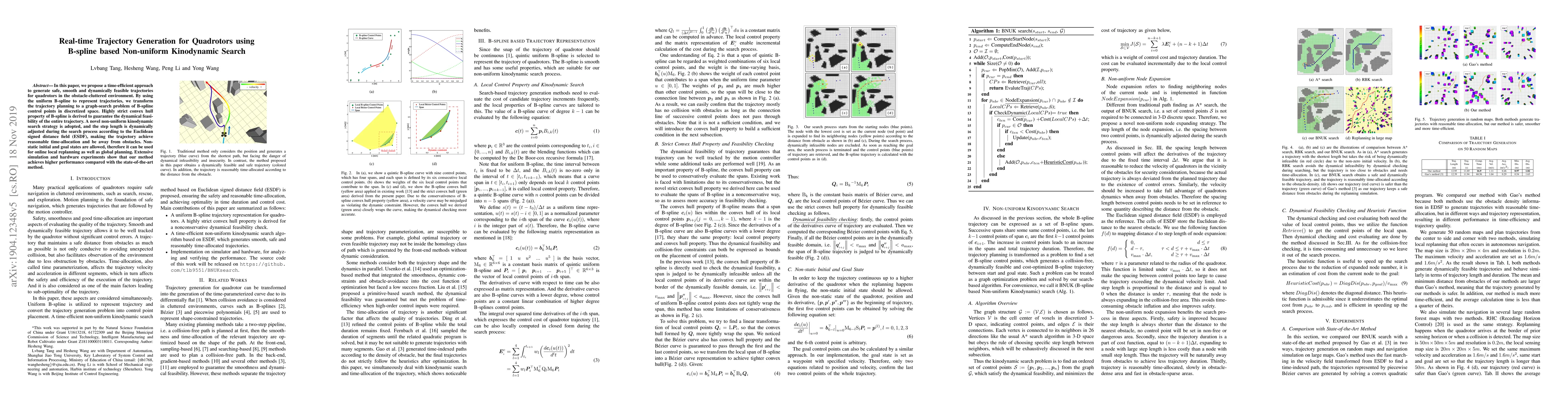 In this paper, we propose a time-efficient approach to generate safe, smooth and dynamically feasible trajectories for quadrotors in obstacle-cluttered environment. By using the uniform B-spline to represent trajectories, we transform the trajectory planning to a graph-search problem of B-spline control points in discretized space. Highly strict convex hull property of B-spline is derived to guarantee the dynamical feasibility of the entire trajectory. A novel non-uniform kinodynamic search strategy is adopted, and the step length is dynamically adjusted during the search process according to the Euclidean signed distance field (ESDF), making the trajectory achieve reasonable time-allocation and be away from obstacles. Non-static initial and goal states are allowed, therefore it can be used for online local replanning as well as global planning. Extensive simulation and hardware experiments show that our method achieves higher performance comparing with the state-of-the-art method.