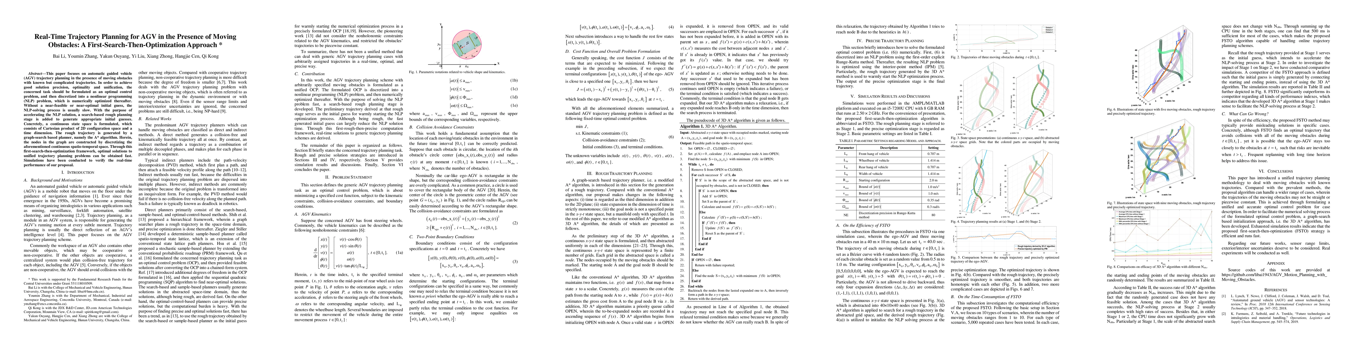 This paper focuses on automatic guided vehicle (AGV) trajectory planning in the presence of moving obstacles with known but complicated trajectories. In order to achieve good solution precision, optimality and unification, the concerned task should be formulated as an optimal control problem, and then discretized into a nonlinear programming (NLP) problem, which is numerically optimized thereafter. Without a near-feasible or near-optimal initial guess, the NLP-solving process is usually slow. With the purpose of accelerating the NLP solution, a search-based rough planning stage is added to generate appropriate initial guesses. Concretely, a continuous state space is formulated, which consists of Cartesian product of 2D configuration space and a time dimension. The rough trajectory is generated by a graph-search based planner, namely the A* algorithm. Herein, the nodes in the graph are constructed by discretizing the aforementioned continuous spatio-temporal space. Through this first-search-then-optimization framework, optimal solutions to unified trajectory planning problems can be obtained fast. Simulations have been conducted to verify the real-time performance of our proposal.