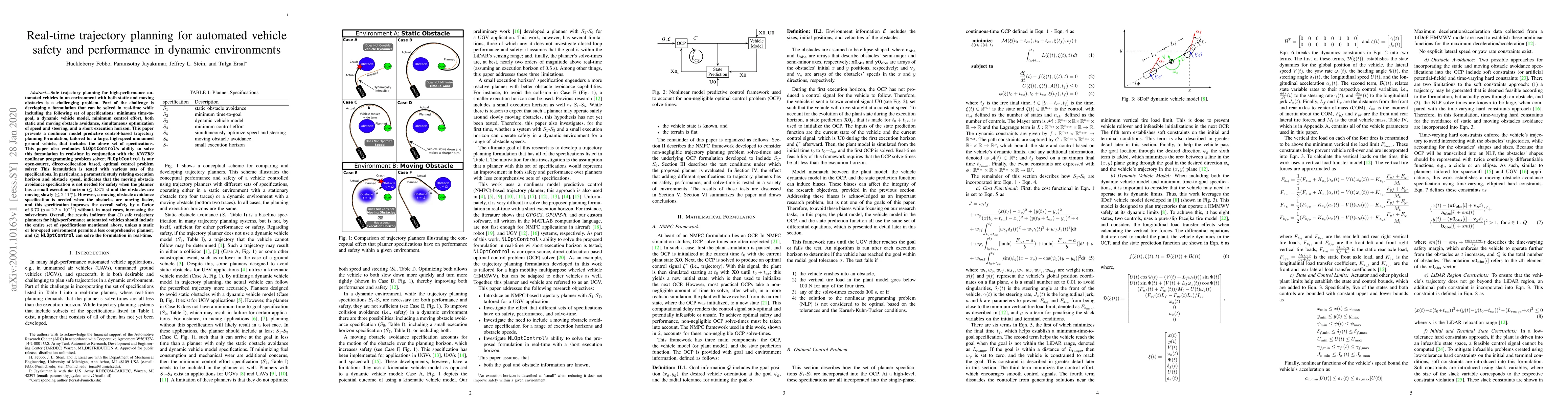 Safe trajectory planning for high-performance automated vehicles in an environment with both static and moving obstacles is a challenging problem. Part of the challenge is developing a formulation that can be solved in real-time while including the following set of specifications: minimum time-to-goal, a dynamic vehicle model, minimum control effort, both static and moving obstacle avoidance, simultaneous optimization of speed and steering, and a short execution horizon. This paper presents a nonlinear model predictive control-based trajectory planning formulation, tailored for a large, high-speed unmanned ground vehicle, that includes the above set of specifications. This paper also evaluates NLOptControl's ability to solve this formulation in real-time in conjunction with the KNITRO nonlinear programming problem solver; NLOptControl is our open-source, direct-collocation based, optimal control problem solver. This formulation is tested with various sets of the specifications. In particular, a parametric study relating execution horizon and obstacle speed, indicates that the moving obstacle avoidance specification is not needed for safety when the planner has a small execution horizon ($\leq0.375\;s$) and the obstacles are moving slowly ($\leq2.11\frac{m}{s}$). However, a moving obstacle avoidance specification is needed when the obstacles are moving faster, and this specification improves the overall safety by a factor of $6.73$ ($p=2.2\times10^{-16}$) without, in most cases, increasing the solve-times. Overall, the results indicate that (1) safe trajectory planners for high-performance automated vehicles should include the entire set of specifications mentioned above, unless a static or low-speed environment permits a less comprehensive planner; and (2) NLOptControl can solve the formulation in real-time.