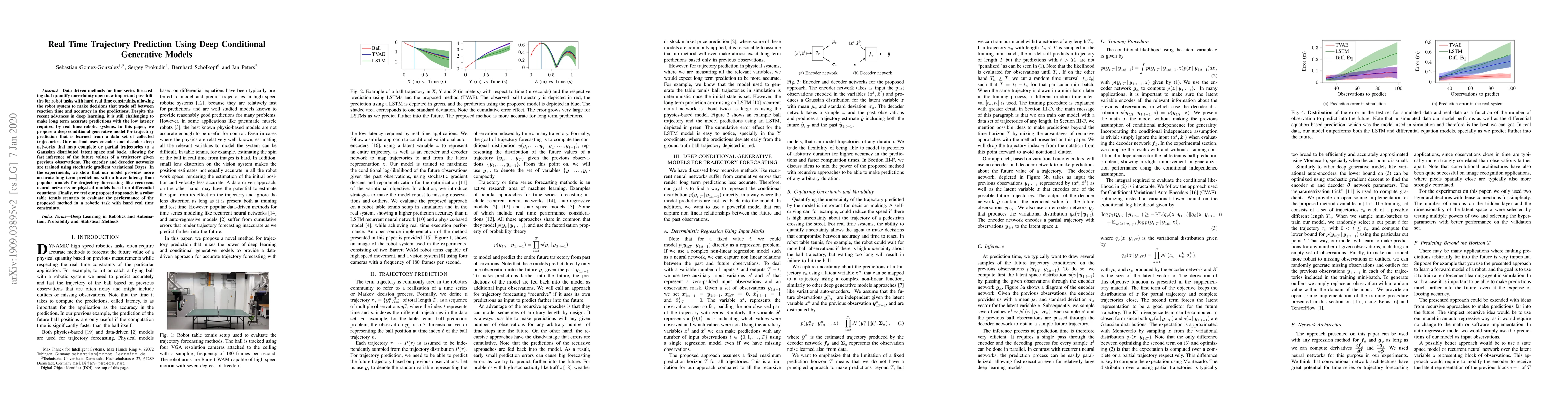 This paper proposes a deep conditional generative model for real-time trajectory prediction, utilizing encoder-decoder networks to map trajectories to a latent space for fast inference. The model demonstrates improved long-term accuracy and lower latency compared to recurrent neural networks and differential equation-based models, validated through a robot table tennis scenario.