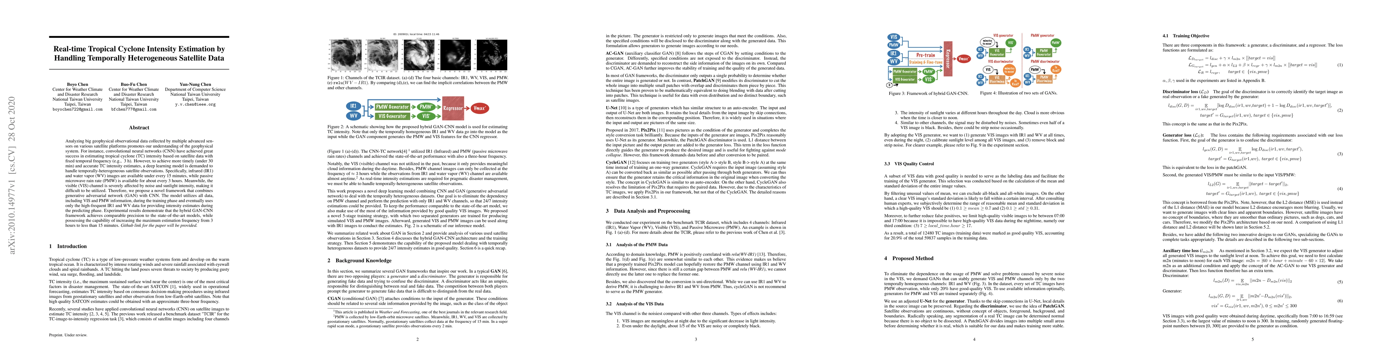 This paper proposes a hybrid GAN-CNN framework for real-time tropical cyclone intensity estimation using temporally heterogeneous satellite data. The model effectively integrates various data types, including noisy visible channel data, to achieve high-frequency intensity estimates, improving estimation frequency from 3 hours to under 15 minutes.