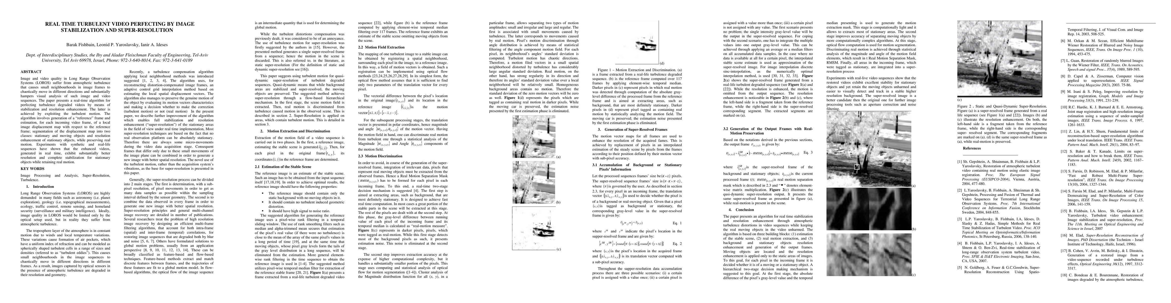 This paper proposes a real-time algorithm to enhance turbulence-degraded videos in Long Range Observation Systems by stabilizing them and super-resolving images, achieving better resolution and stabilization of stationary objects while preserving real motion. Experiments demonstrate improved video quality and stabilization in both synthetic and real-life sequences.