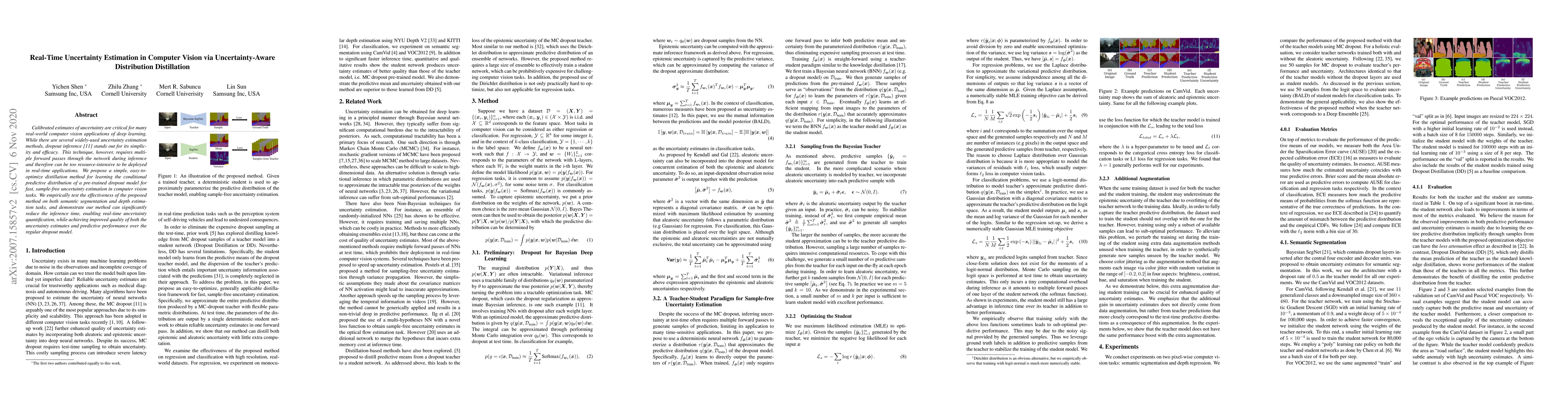 This paper proposes an uncertainty-aware distillation method for real-time uncertainty estimation in computer vision, significantly reducing inference time compared to dropout inference while maintaining or improving the quality of uncertainty estimates and predictive performance. The method is tested on semantic segmentation and depth estimation tasks.