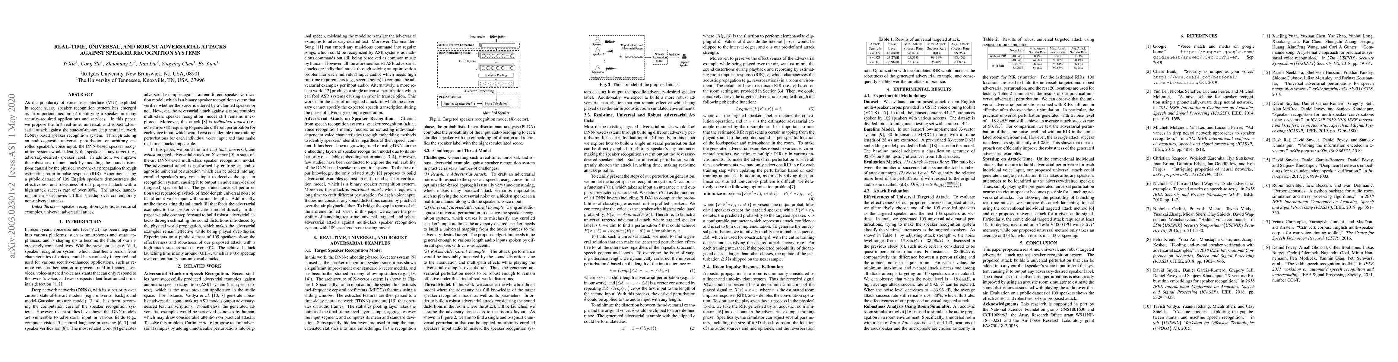 This paper introduces a real-time, universal, and robust adversarial attack against deep neural network-based speaker recognition systems, enabling the misidentification of any enrolled speaker as a target label. The attack achieves high success rates and a significant speedup by incorporating sound distortions modeled through room impulse response estimation.