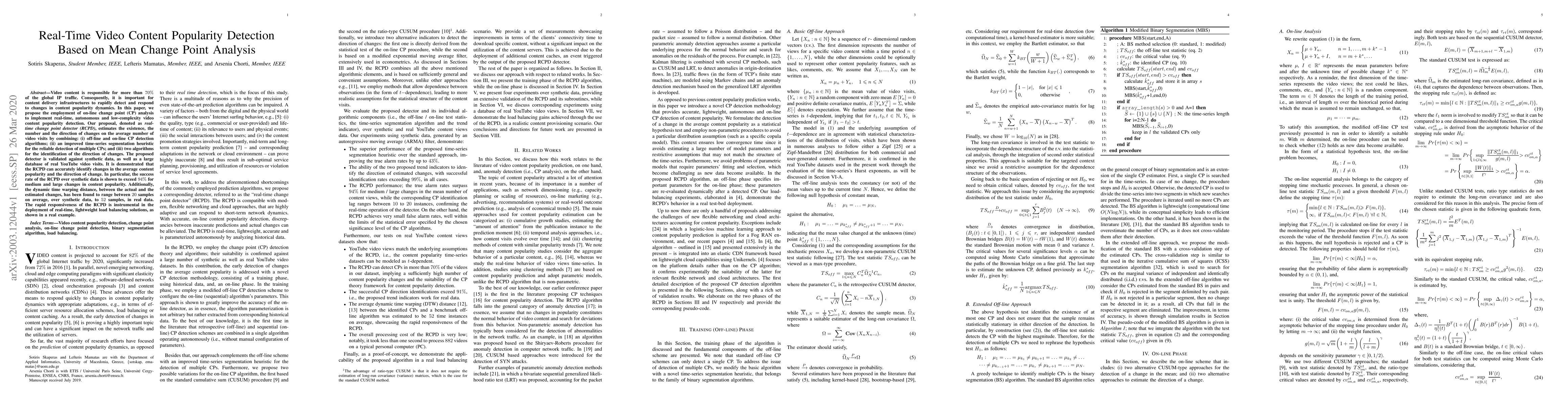Video content is responsible for more than 70% of the global IP traffic. Consequently, it is important for content delivery infrastructures to rapidly detect and respond to changes in content popularity dynamics. In this paper, we propose the employment of on-line change point (CP) analysis to implement real-time, autonomous and low-complexity video content popularity detection. Our proposal, denoted as real-time change point detector (RCPD), estimates the existence, the number and the direction of changes on the average number of video visits by combining: (i) off-line and on-line CP detection algorithms; (ii) an improved time-series segmentation heuristic for the reliable detection of multiple CPs; and (iii) two algorithms for the identification of the direction of changes. The proposed detector is validated against synthetic data, as well as a large database of real YouTube video visits. It is demonstrated that the RCPD can accurately identify changes in the average content popularity and the direction of change. In particular, the success rate of the RCPD over synthetic data is shown to exceed 94% for medium and large changes in content popularity. Additionally,the dynamic time warping distance, between the actual and the estimated changes, has been found to range between20sampleson average, over synthetic data, to52samples, in real data.The rapid responsiveness of the RCPD is instrumental in the deployment of real-time, lightweight load balancing solutions, as shown in a real example.