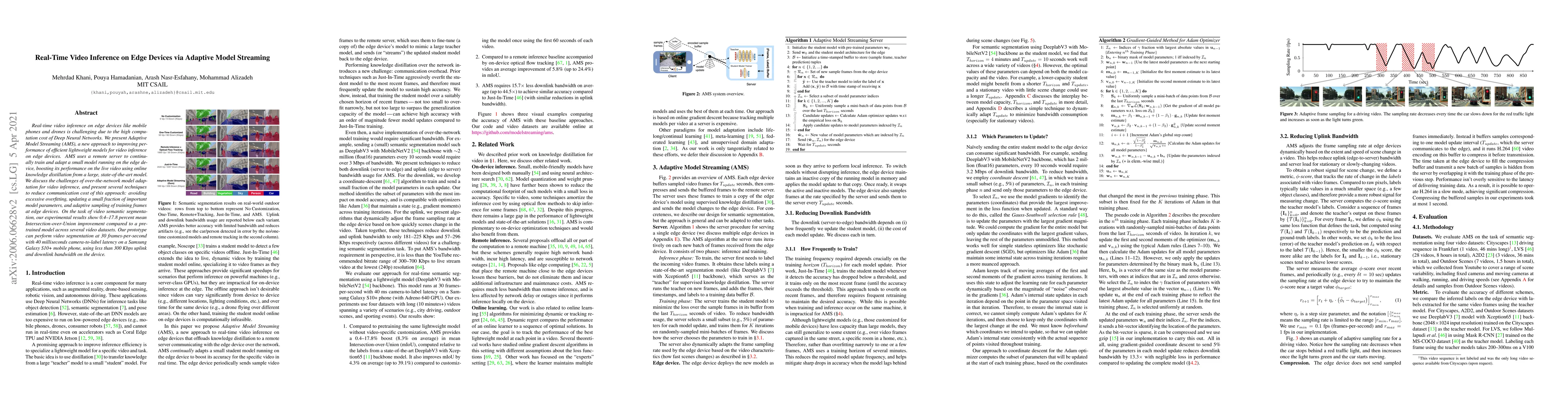 This paper introduces Adaptive Model Streaming (AMS) to enhance real-time video inference on edge devices by leveraging continual training and adaptation from a remote server, achieving significant performance improvements in lightweight models through online knowledge distillation and techniques to minimize communication costs. Experimental results demonstrate notable improvements in video semantic segmentation on mobile devices with minimal bandwidth usage.