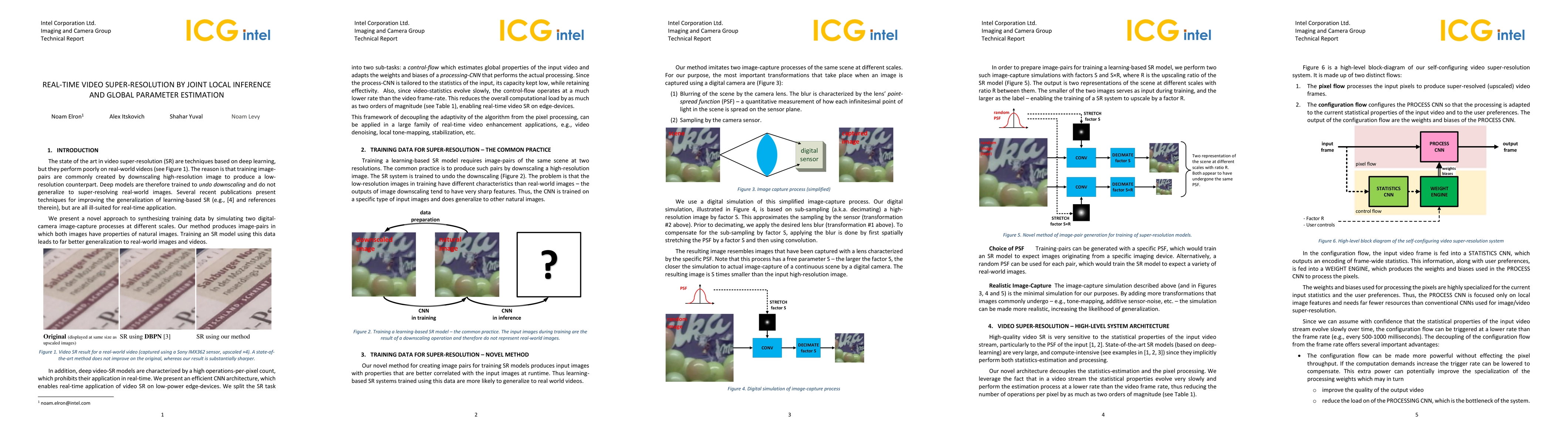 This paper proposes a novel method for real-time video super-resolution using a joint local inference and global parameter estimation approach. It synthesizes training data simulating digital-camera image-capture processes, leading to better generalization for real-world videos. An efficient CNN architecture is introduced to reduce computational load, enabling real-time video SR on low-power edge-devices.