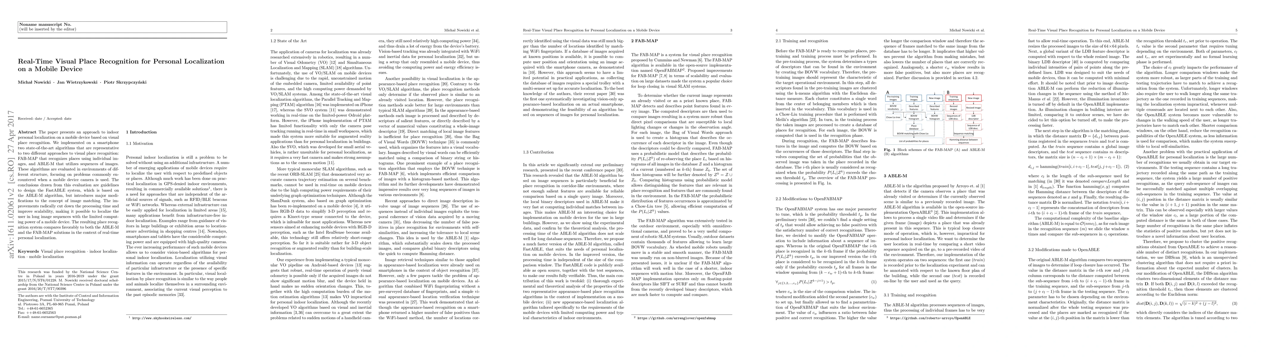 This paper introduces an indoor localization system for mobile devices using real-time visual place recognition, implementing two state-of-the-art algorithms and developing the FastABLE system to optimize processing speed and scalability. The FastABLE system significantly reduces processing time, enabling efficient localization in long image sequences.