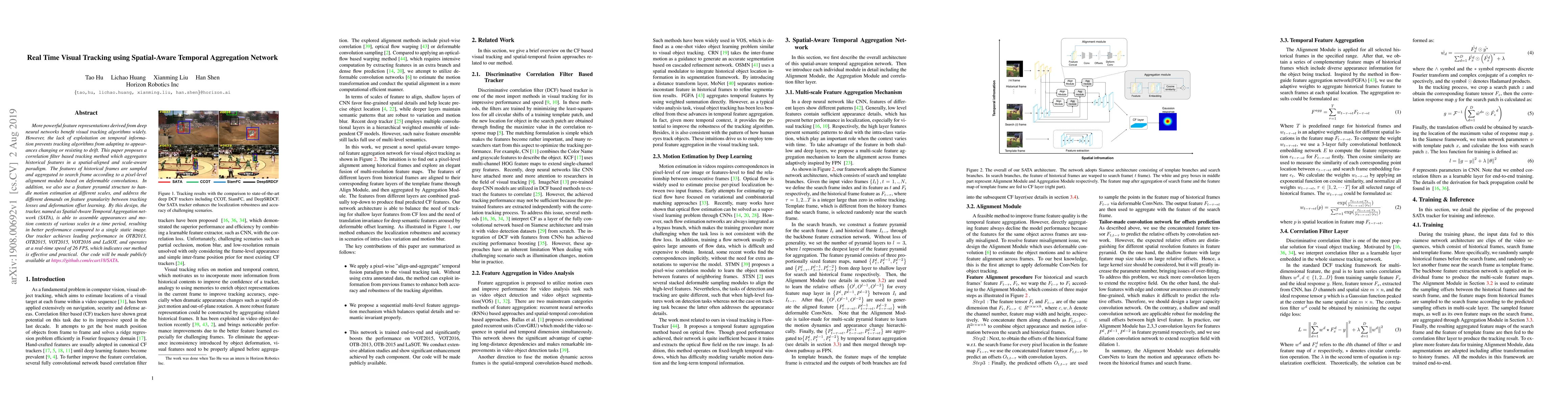 This paper introduces a real-time visual tracking method called Spatial-Aware Temporal Aggregation network (SATA) that leverages temporal information through spatial-aligned historical feature aggregation and scale-aware feature pyramids, achieving superior performance on multiple tracking benchmarks. The proposed method operates at a real-time speed of 26 FPS.