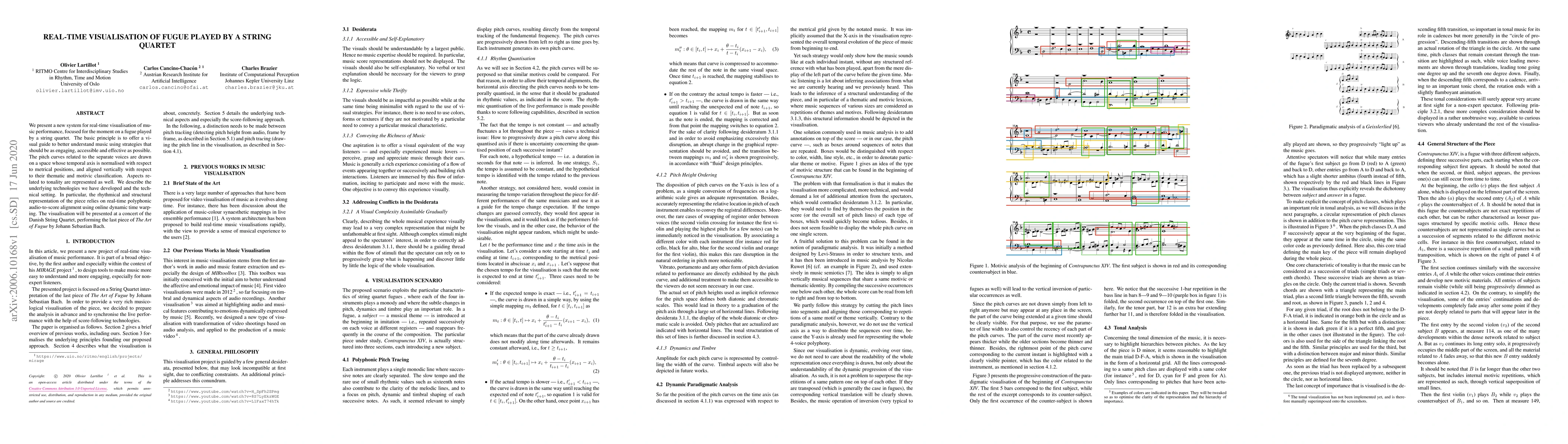 We present a new system for real-time visualisation of music performance, focused for the moment on a fugue played by a string quartet. The basic principle is to offer a visual guide to better understand music using strategies that should be as engaging, accessible and effective as possible. The pitch curves related to the separate voices are drawn on a space whose temporal axis is normalised with respect to metrical positions, and aligned vertically with respect to their thematic and motivic classification. Aspects related to tonality are represented as well. We describe the underlying technologies we have developed and the technical setting. In particular, the rhythmical and structural representation of the piece relies on real-time polyphonic audio-to-score alignment using online dynamic time warping. The visualisation will be presented at a concert of the Danish String Quartet, performing the last piece of The Art of Fugue by Johann Sebastian Bach.