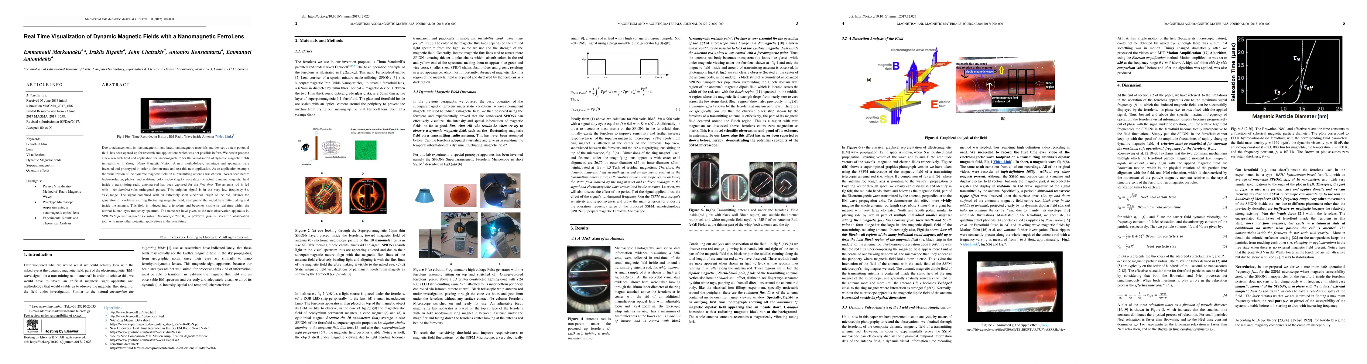 Due to advancements in nanomagnetism and latest nanomagnetic materials and devices, a new potential field has been opened up for research and applications which was not possible before. We herein propose a new research field and application for nanomagnetism for the visualization of dynamic magnetic fields in real-time. In short, Nano Magnetic Vision. A new methodology, technique and apparatus were invented and prototyped in order to demonstrate and test this new application. As an application example the visualization of the dynamic magnetic field on a transmitting antenna was chosen. Never seen before high-resolution, photos and real-time color video revealing the actual dynamic magnetic field inside a transmitting radio antenna rod has been captured for the first time. The antenna rod is fed with six hundred volts, orthogonal pulses. This unipolar signal is in the very low frequency (i.e. VLF) range. The signal combined with an extremely short electrical length of the rod, ensures the generation of a relatively strong fluctuating magnetic field, analogue to the signal transmitted, along and inside the antenna. This field is induced into a ferrolens and becomes visible in real-time within the normal human eyes frequency spectrum. The name we have given to the new observation apparatus is, SPIONs Superparamagnetic Ferrolens Microscope (SSFM), a powerful passive scientific observation tool with many other potential applications in the near future.